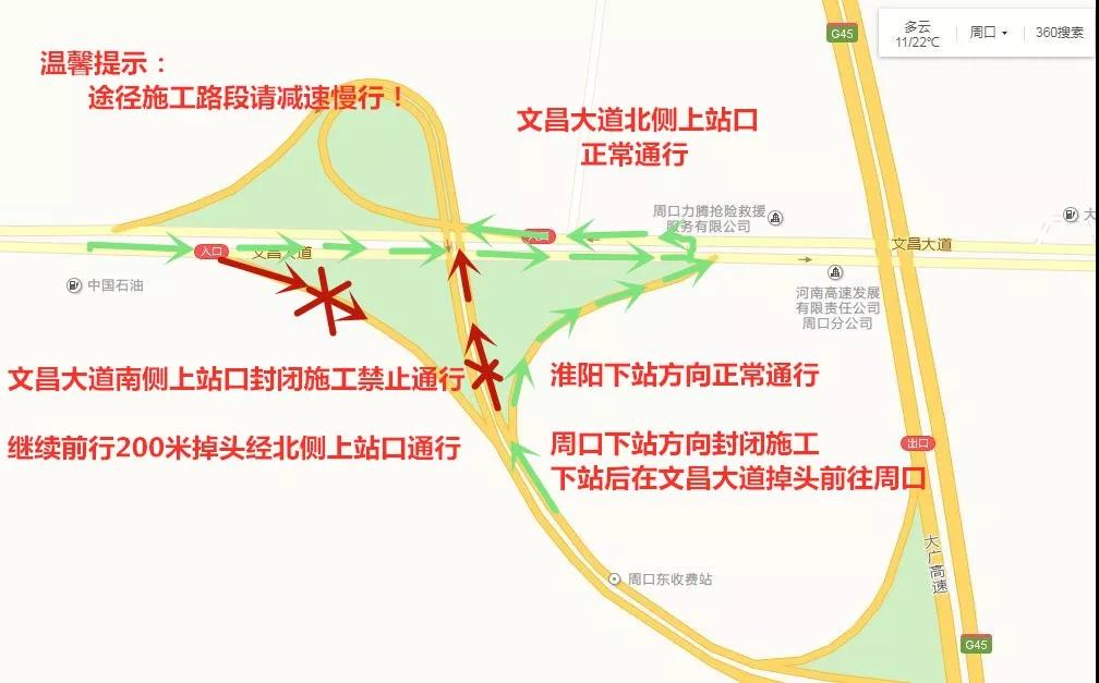 对此,交警提示:文昌大道西向东方向需转大广高速车辆,请通过施工路段后继续前行200米掉头从文昌大道北半幅入口转入大广高速。从周口东站下道需往周口市区方向车辆请按标牌提示,从淮阳方向下道至文昌大道50米后掉头,从文昌大道北半幅东向西方向去周口市区。请途经施工路段车辆注意观察提示标牌,服从现场工作人员指挥。