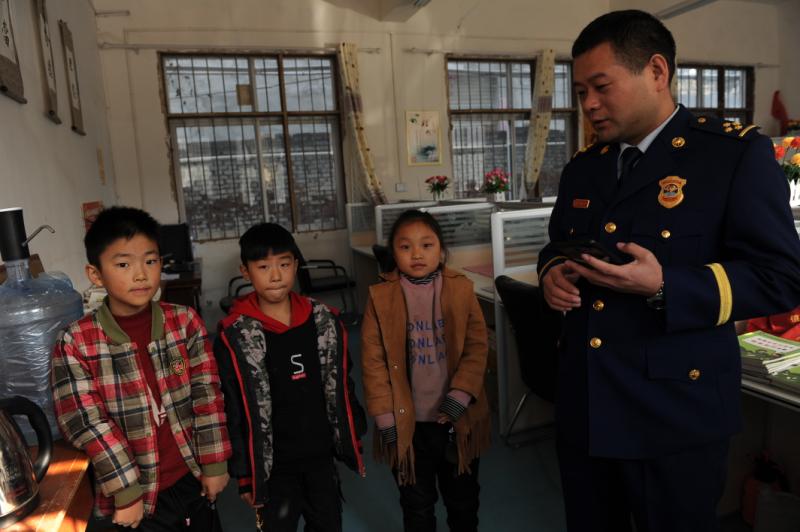 汝州消防大队的同志在学校寻找为消防车带路的孩子