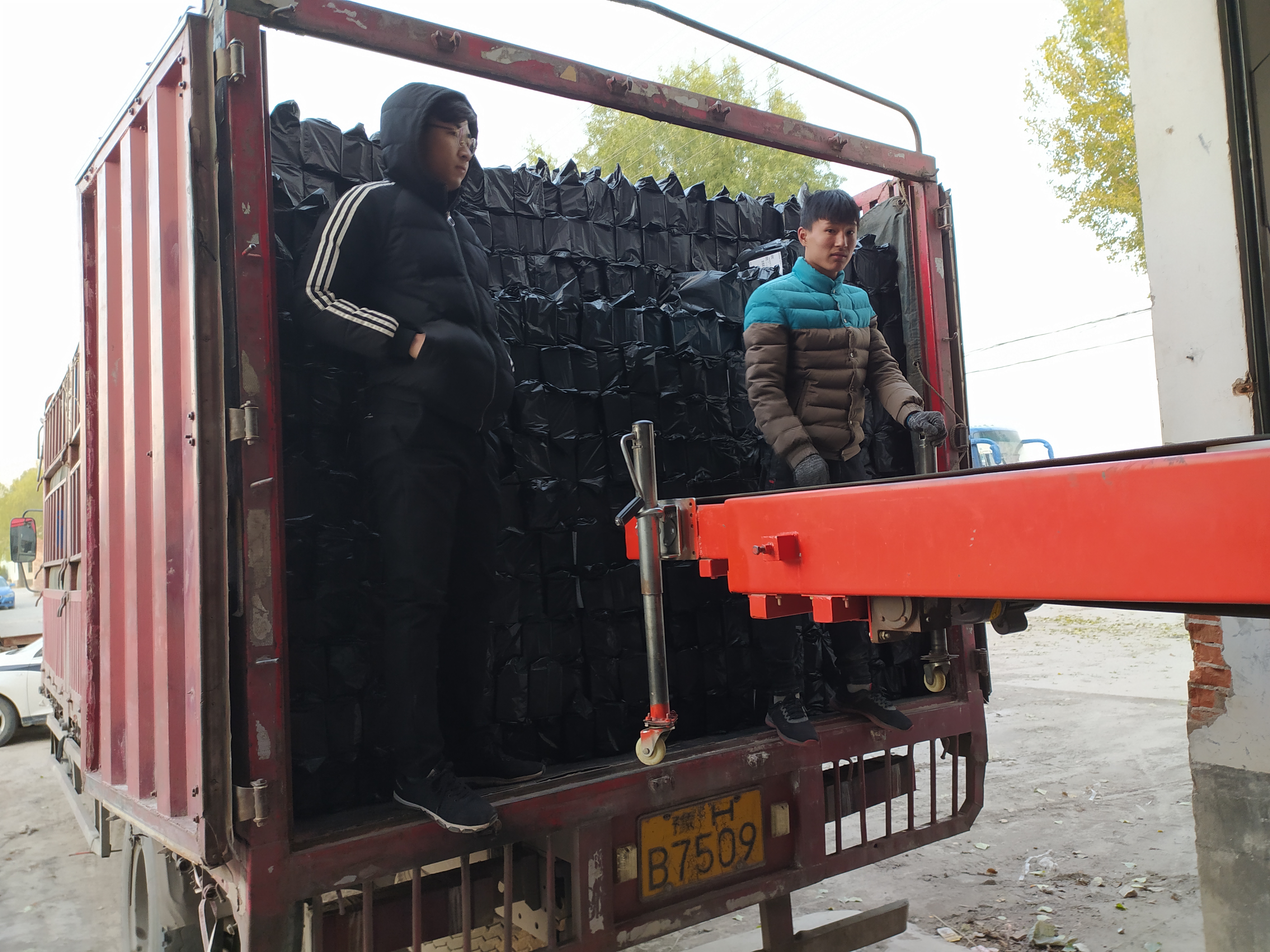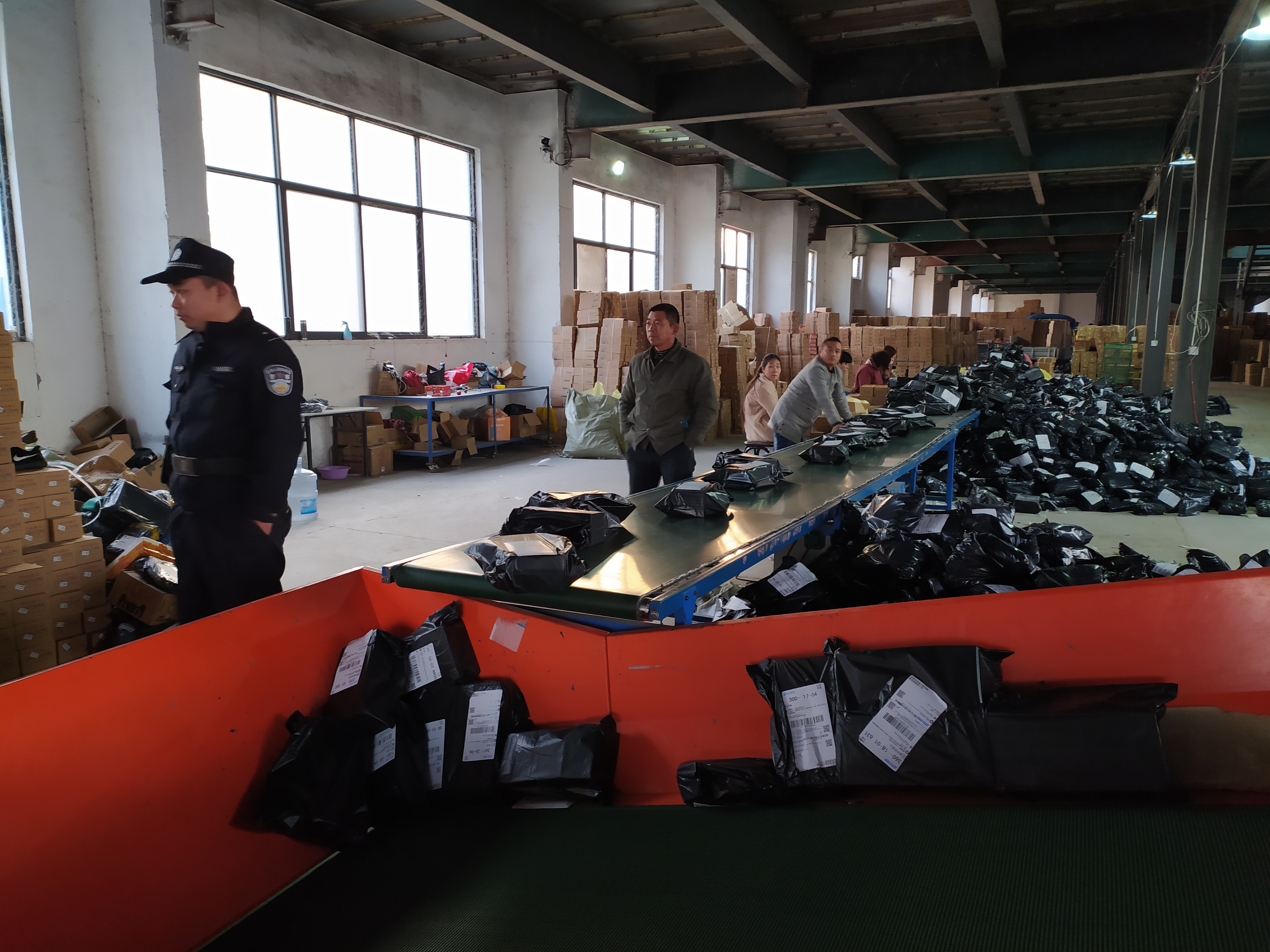 此时,这处紧邻北朱线、类似大型车间的大型钢构仓库内,不少工人分工明显,正在传送带旁包装、发货,旁边已经粘贴完快递单据的鞋盒大小包裹及各种成品鞋堆了一地。传送带尽头,几名工人正向一辆焦作牌照大货车车厢内装运包裹。