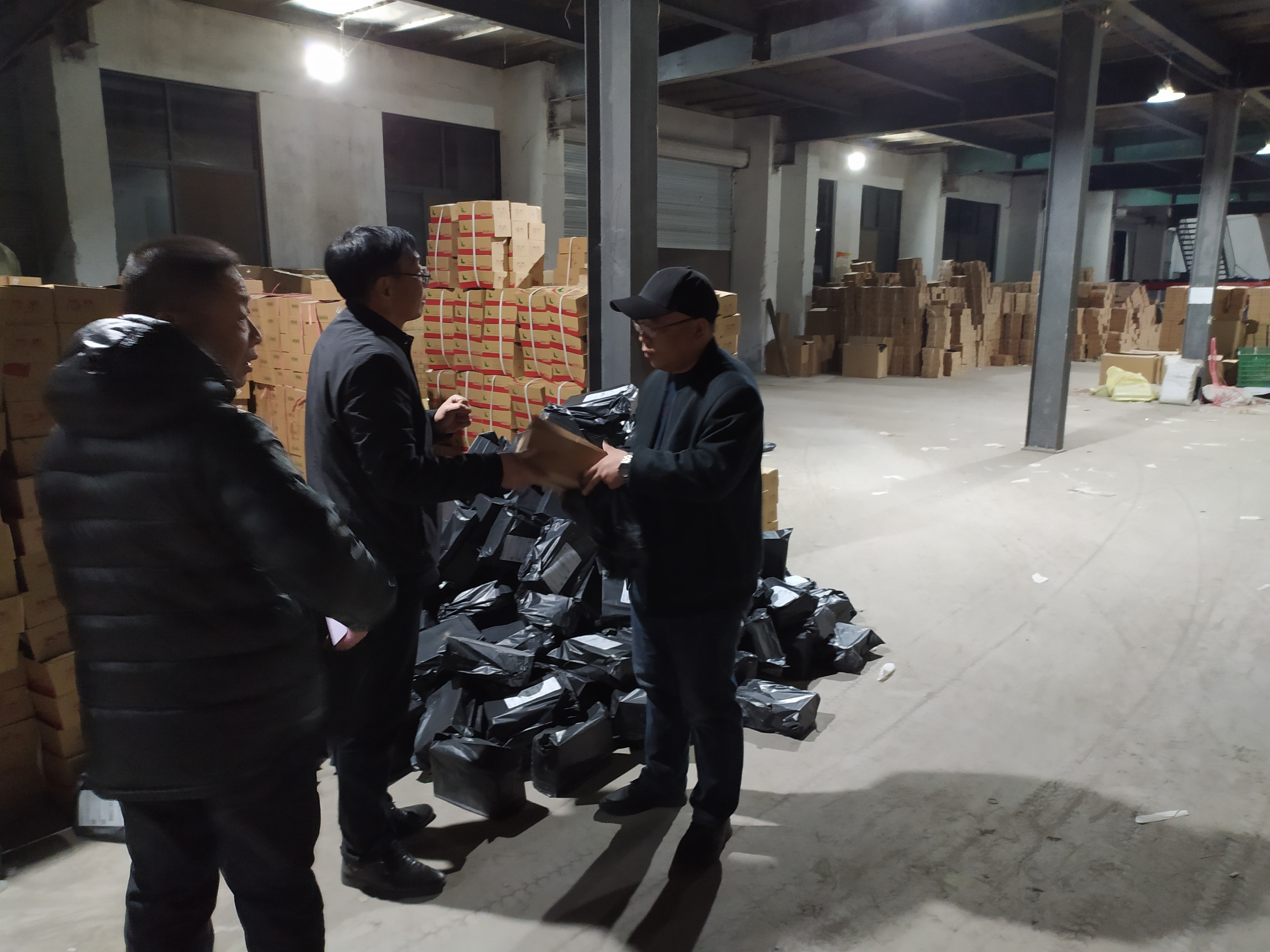 当天下午5时30分许,温县市场监督管理局执法人员乘坐两辆车赶到,再次对该仓库内存放的相关成品鞋进行了检查。