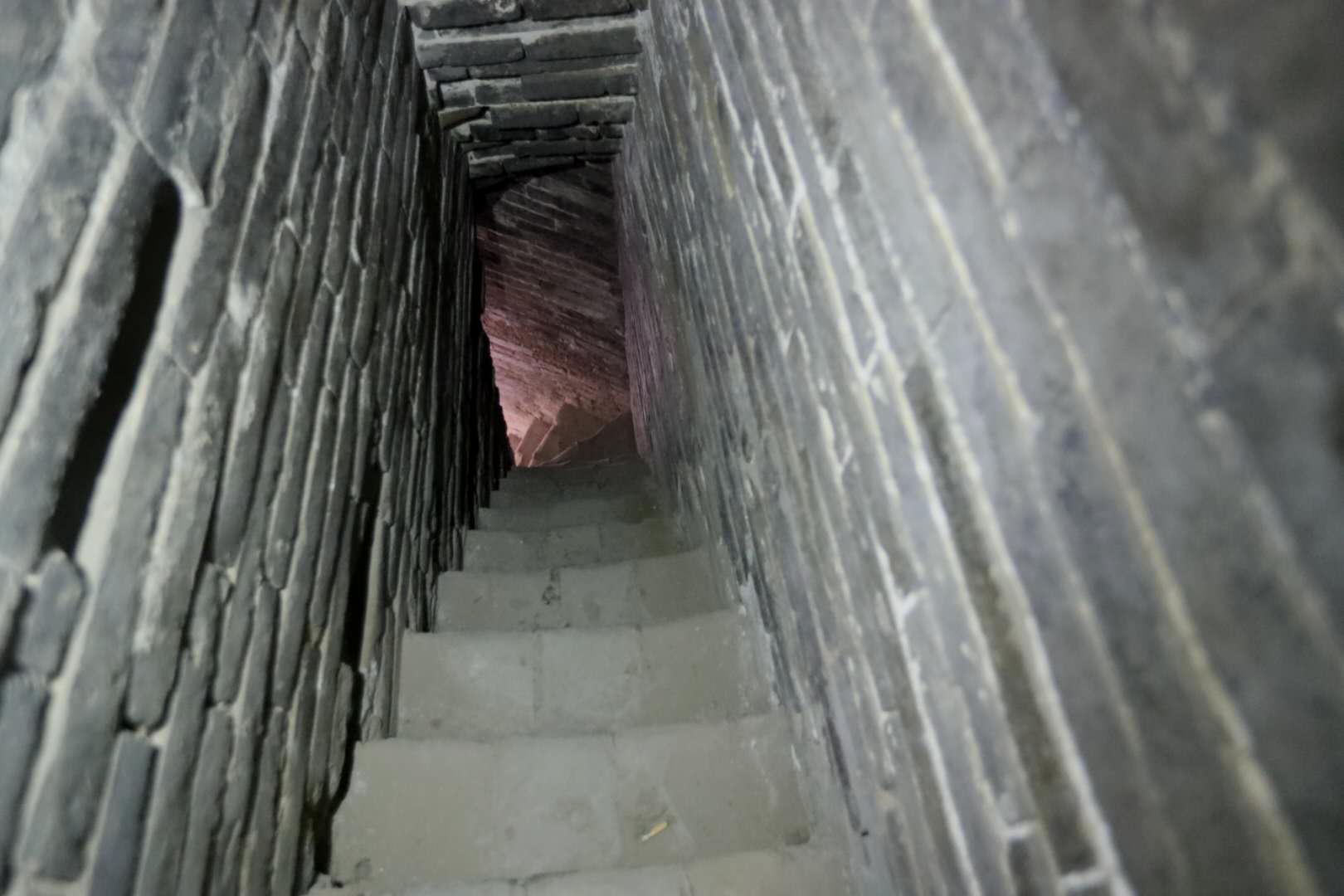 到达第五层时,古塔设计师和时空另一端的登塔者玩起了捉迷藏。三个方向一模一样甬道,竟然都不见攀登旋梯,俯身观察,柳暗花明,原来藏在其中一个甬道的侧壁。建筑凝固了千年前的小幽默,仍在继续逗乐着后来人。