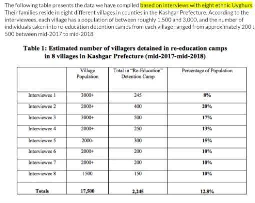 第一项研究,由美国政府支持的“中国人权捍卫者网络(Chinese Human Rights Defenders,CHRD)”,仅仅通过对8个人采访就推算出100万人被拘留在“再教育拘留营”、200万人“被迫参加白天或晚上的再教育课程”。2018年,CHRD将这个数据写进一份报告提交给联合国消除种族歧视委员会。