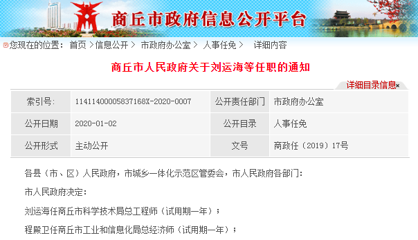 大河财立方消息 1月2日,商丘市人民政府网站公布最新一批人事任免。