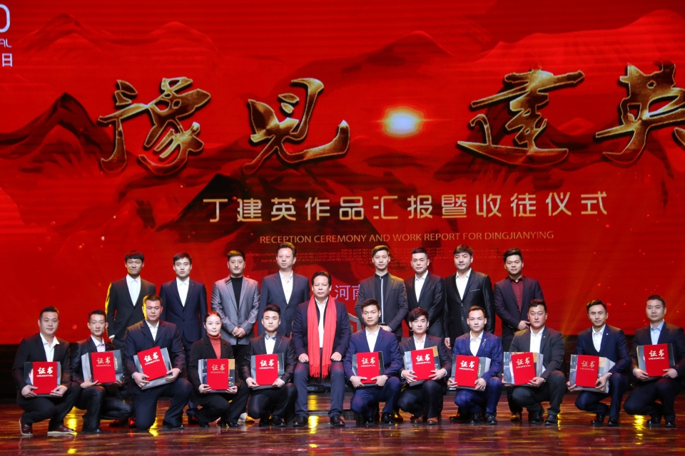 活动现场,焦作市豫剧院康建广、漯河市豫剧团刘少武、开封市豫剧院副院长魏占桥、漯河市豫剧团周杨威、商丘市豫剧院张永杰、河南豫剧院二团连彩芬和王馨帅、中国平煤神马集团豫剧团业务团长韩晓伟、河南明星擂主大爱剧团演员胡磊、洛阳豫剧院演员席宁宁、新乡市豫剧团演员刘坤、登封市豫剧团祁元杰共12名弟子正式拜在丁建英门下。