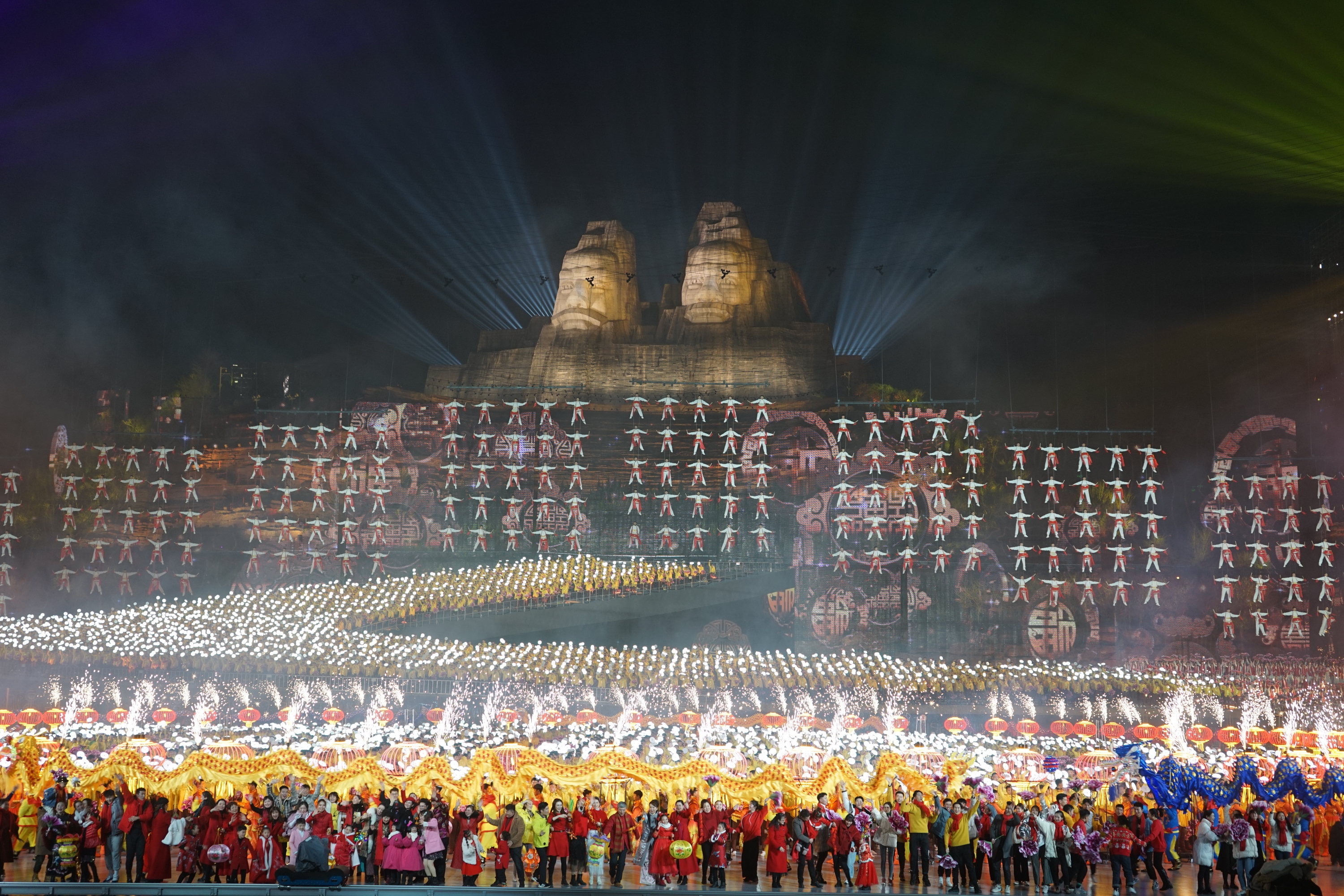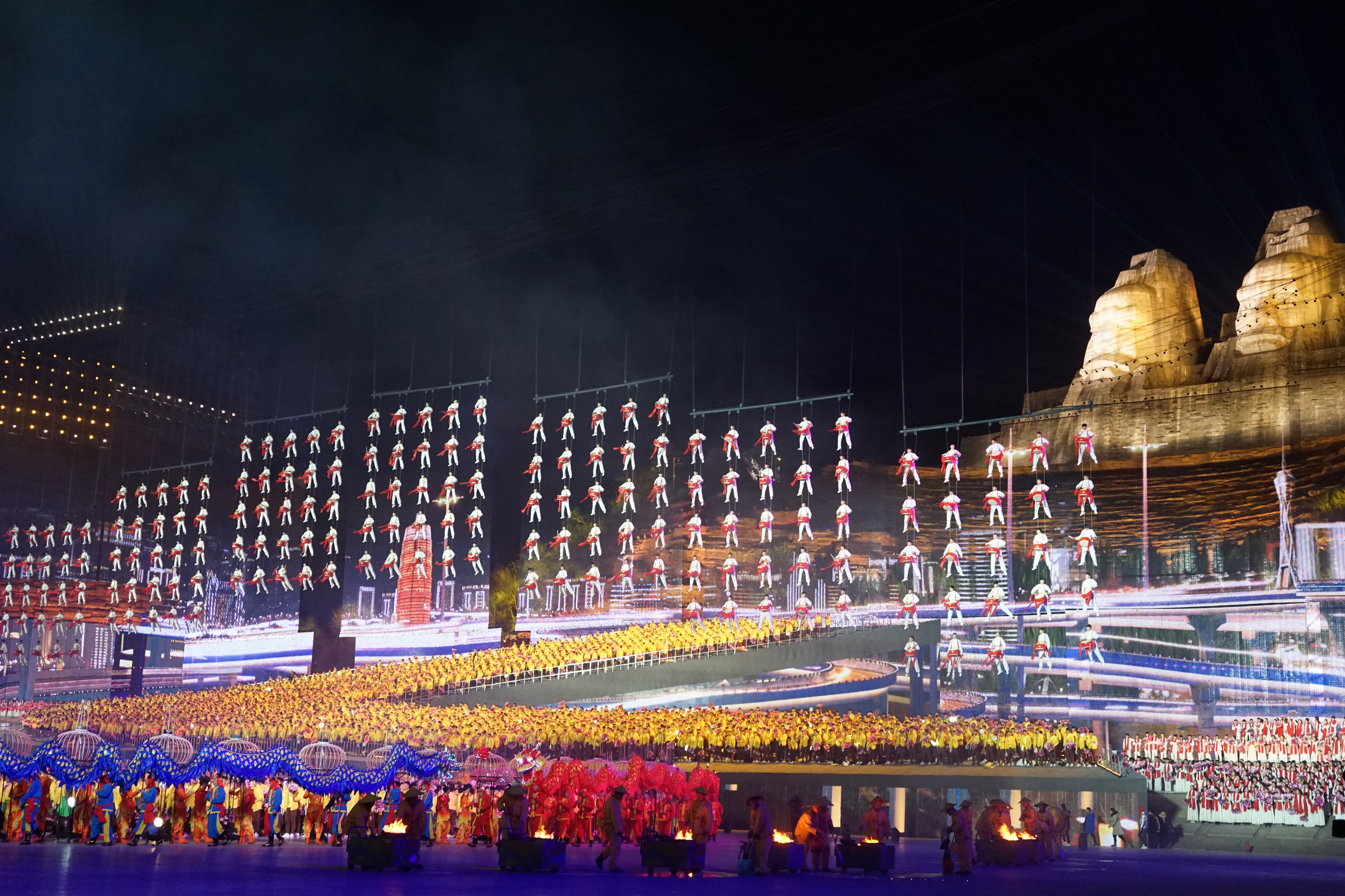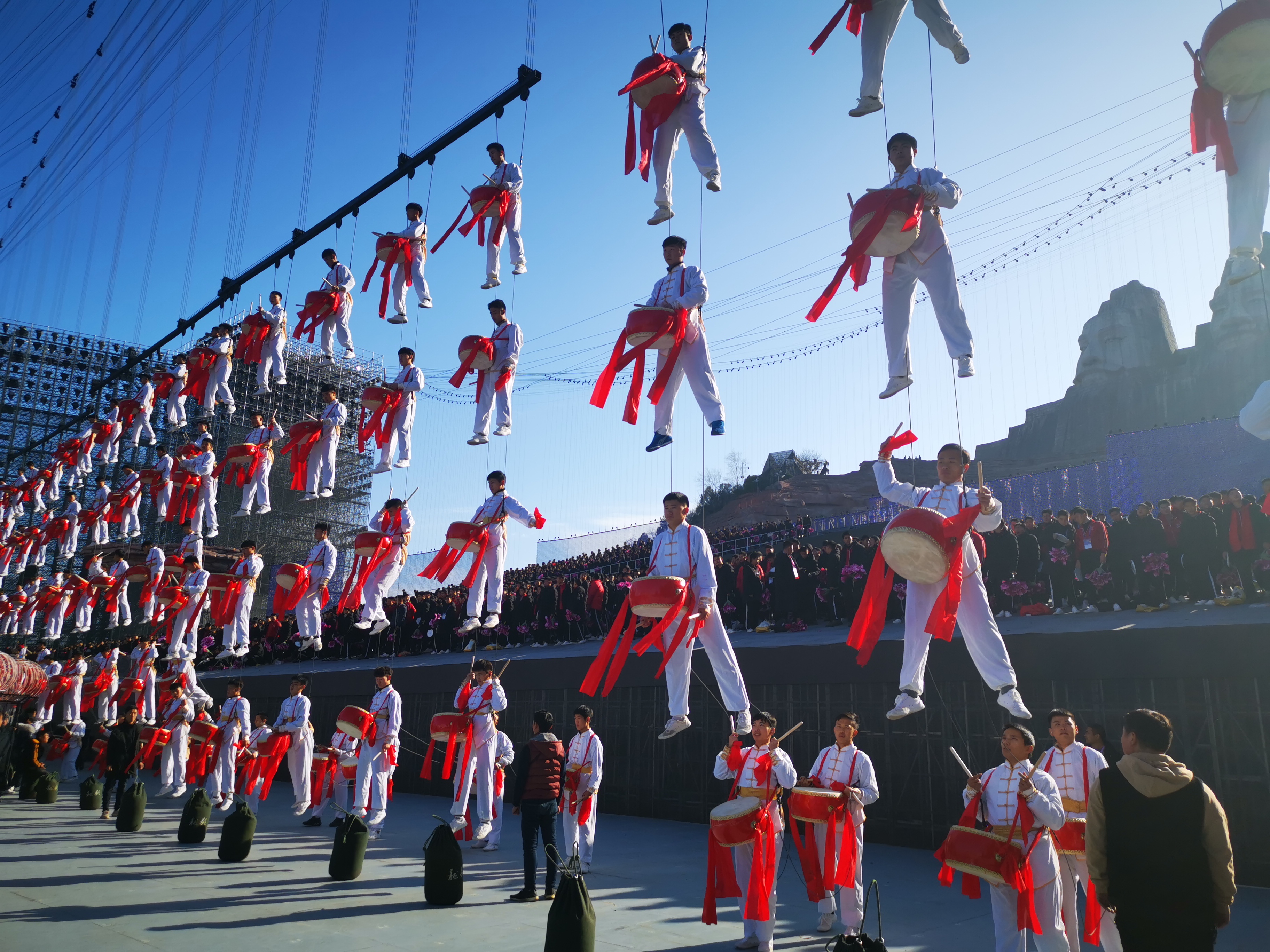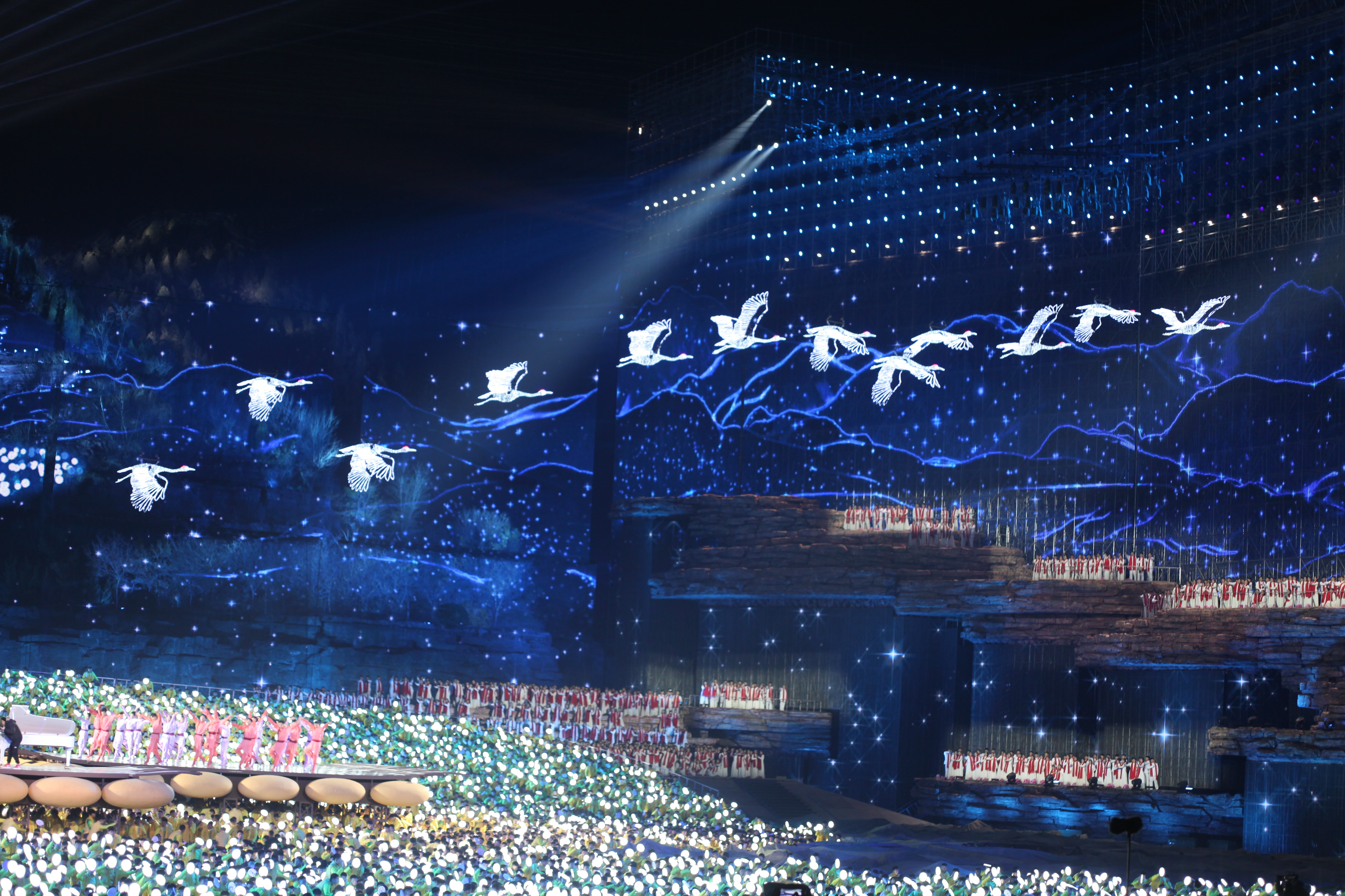 据大河网记者了解,此次威亚的表演分为三个部分,第一部分舞台后方为吊挂网幕区,通过网幕的通透性,结合背景的炎黄二帝像及舞台上黄河的表演造型,来营造出巨大的纵深,恢宏的气势。第二部分为舞台前端的可遥控LED发光的12只仙鹤道具,翼展达6米的仙鹤在会场上空展翅翱翔,给观众带来了喜庆与祥和。第三部分为零点倒计时时,200名鼓手腾空而起,在空中敲响欢庆的锣鼓配合着倒计时,祈祷来年的风调雨顺与幸福安康。
