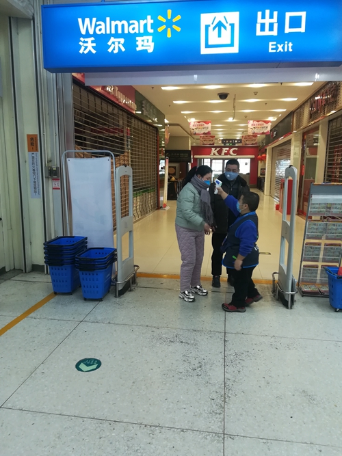 在安阳市沃尔玛超市出入口,工作人员手持体温检测仪对进入超市的每一位顾客进行体温测量。据了解,为了有效防控疫情,安阳市发布通知,自1月26日起,不佩戴口罩者将不能进入商场超市,并在各大商场超市设置了温馨提示牌。