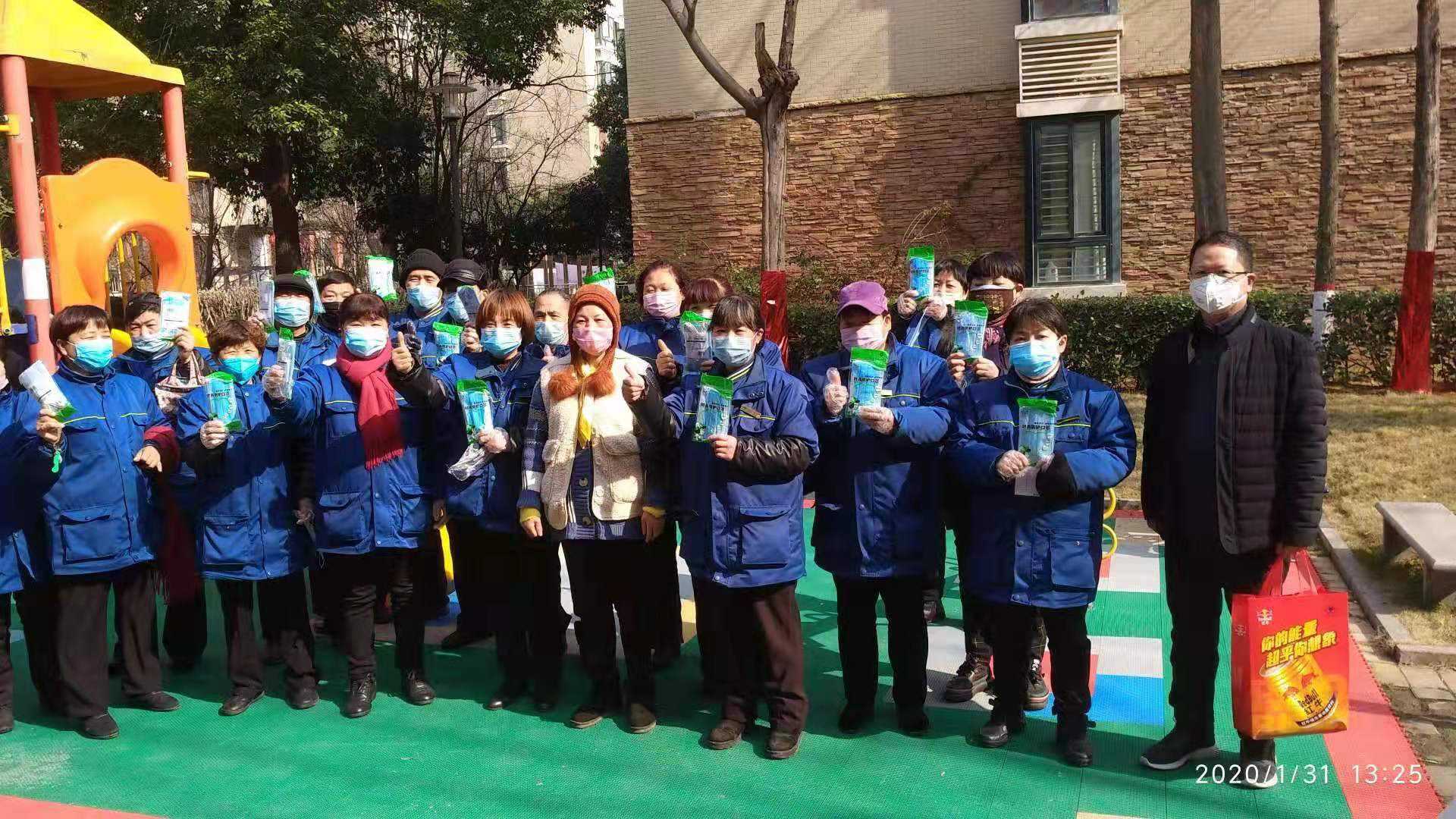 张五红(前中)把口罩发给建业森林半岛附近的环卫工人