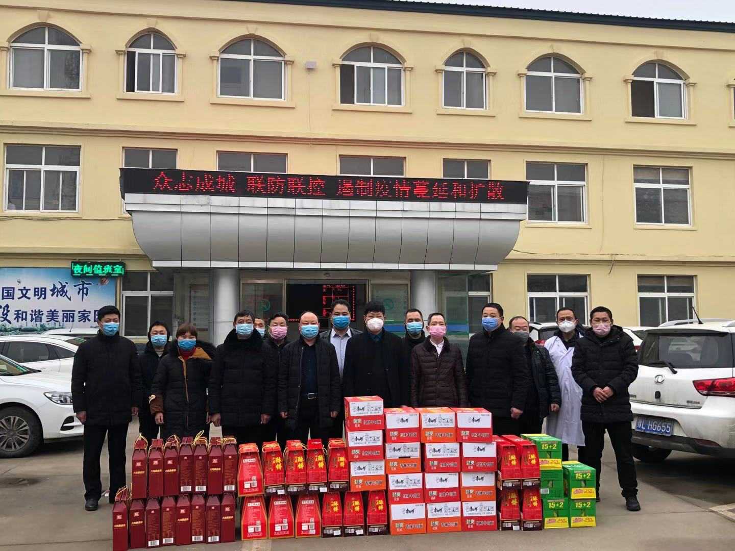 2月7日郑玉海(前右4)带领镇乡村医生自愿者到镇卫生院捐赠物品慰问一线人员
