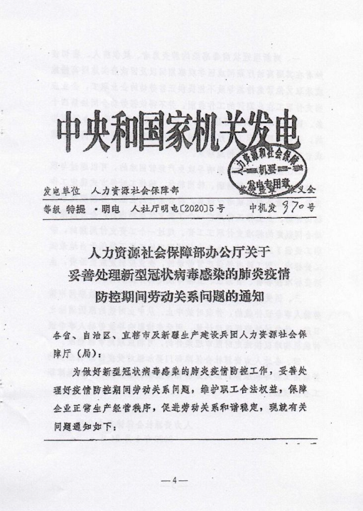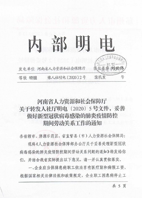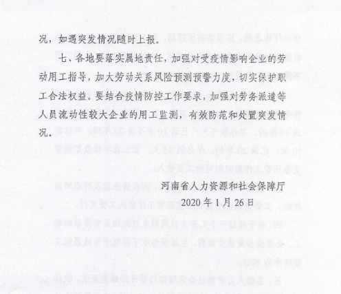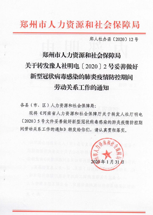 大河财立方消息 2月14日,郑州市人力资源和社会保障局关于转发豫人社明电(2020)2号妥善做好新型冠状病毒的肺炎疫情防控期间劳动关系工作的通知。