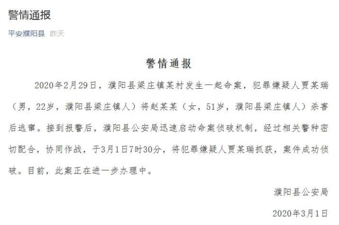 中新网3月2日电 据河南省濮阳县公安局微信公众号消息,2月29日,濮阳县梁庄镇某村发生一起命案,犯罪嫌疑人贾某瑞(男,22岁,濮阳县梁庄镇人)将赵某某(女,51岁,濮阳县梁庄镇人)杀害后逃窜。接到报警后,濮阳县公安局迅速启动命案侦破机制,经过相关警种密切配合,协同作战,于3月1日7时30分,将犯罪嫌疑人贾某瑞抓获,案件成功侦破。