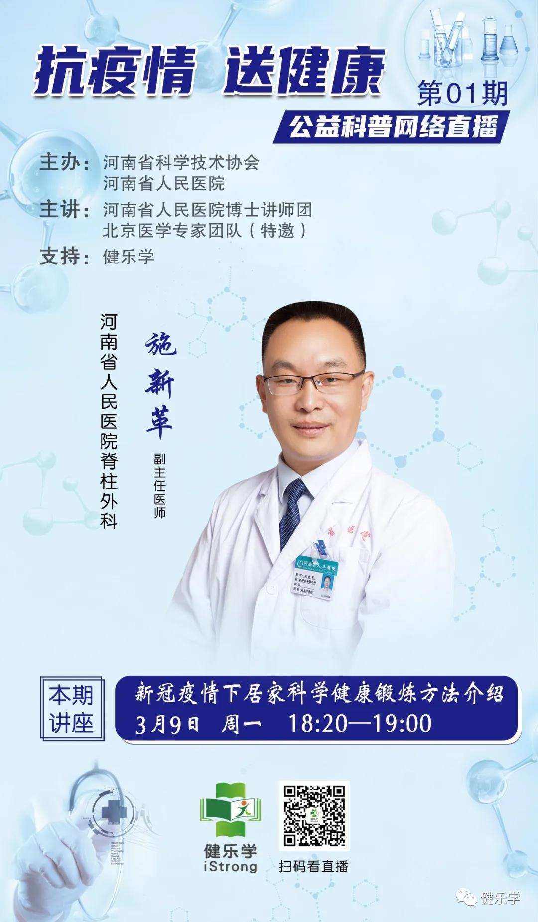 大河网讯(记者 刘杨)新冠疫情下居家如何科学健康锻炼?长期上网课孩子眼睛保健常识及科学锻炼方法有哪些......3月7日,大河网记者获悉,河南省科学技术协会和河南省人民医院联合推出“抗疫情送健康”大型系列公益科普网络直播活动,通过网络免费直播形式,疫情下百姓最关心的居家健康问题解决方案送到千家万户和患者手中。
