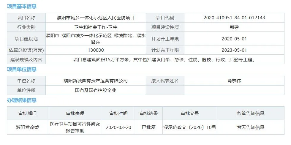 濮阳市城乡一体化示范区人民医院项目项目基本情况1.项目概况:占地200亩(参照技术规范,三级医院规划1000张床位,平均每张床位用地面积120平方米,总用地约180亩,为保证医院功能和品质,计划用地200亩),总建筑面积10万平方米;综合三级甲等医院主要包括:综合医学中心、康复中心、心血管医学中心、肿瘤医学中心、慢病管理中心、医技中心和配套服务中心。项目目建设地:濮阳市-濮阳市城乡一体化示范区-绿城路北,濮水路东,估算总投资130000万元计划开工年限2020-05-01计划完工年限2023-05-01建设规模及内容项目:总建筑面积15万平方米,其中包括建设门诊、急诊、住院、医技、行政、后勤等工程。单位名称:濮阳新城国有资产运营有限公司单位性质:国有及国有控股企业