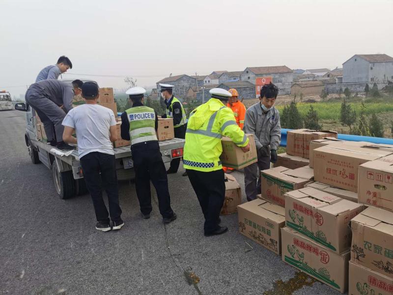 接到报警求助后,邵辉现场化身“搬运工”和清障施救人员一起帮司机把滚落的一箱箱鸡蛋收集起来,然后又重新装上扶正的货车。