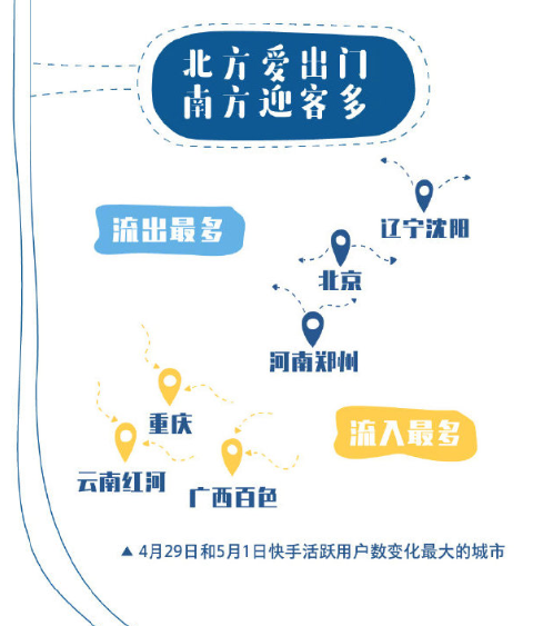 随着各省应急响应级别纷纷调整至二级或以下,人们的出游显然更加热情。在人口流动方面,快手用户的出行呈现出南北差异。5月1日当天,北京、郑州、沈阳都是出行较多的城市;而流入最多的城市则集中分布在南方,排名前三的城市有重庆、广西百色和云南红河州,小众目的地获得关注。但出游热情并未全面恢复:5月1日当天,全国高速拥堵里程占比较去年同期下降11.6%