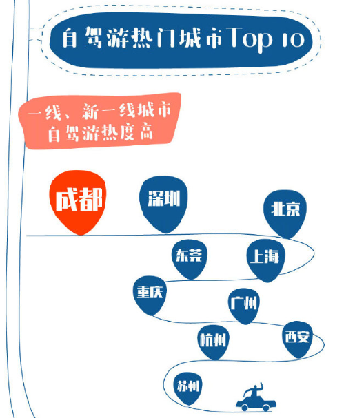 全国自驾游热度最高的10个城市集中在一线和新一线,其中8个均为南方城市,成都超过深圳、北京、上海,排名第一;东莞排名第五,自驾游热度超过广州;北方城市还有西安上榜,排名第八,重庆、杭州、苏州亦榜上有名。