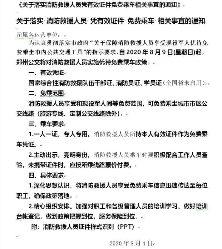 而在8月4日,郑州市公交总公司就曾下发《关于落实消防救援人员凭有效证件免费乘车相关事宜的通知》,其中明确要求,要深化思想认识,将消防救援人员享受免费乘车信息迅速传达至每位职工,确保政策落地。