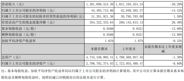 【大河财立方消息】8月19日,恒星科技发布半年报,报告期内,公司实现营业收入13.02亿元,同比下降20.2%;营业成本10.98亿元,同比下降21.98%;毛利2.04亿元,毛利率15.64%,较去年同期增长1.92%;归属于上市公司股东的净利润4449.37万元,同比减少14.52%。