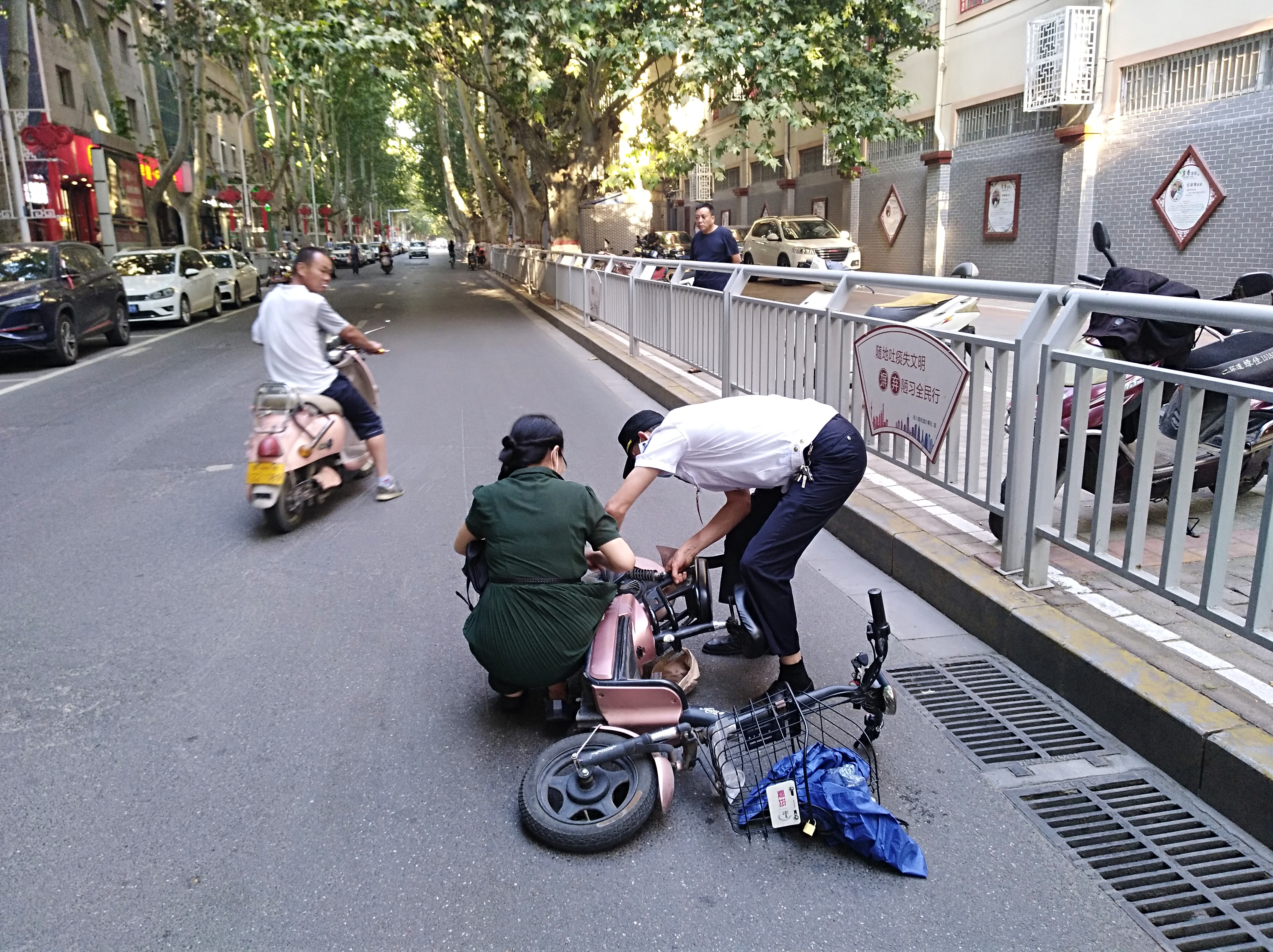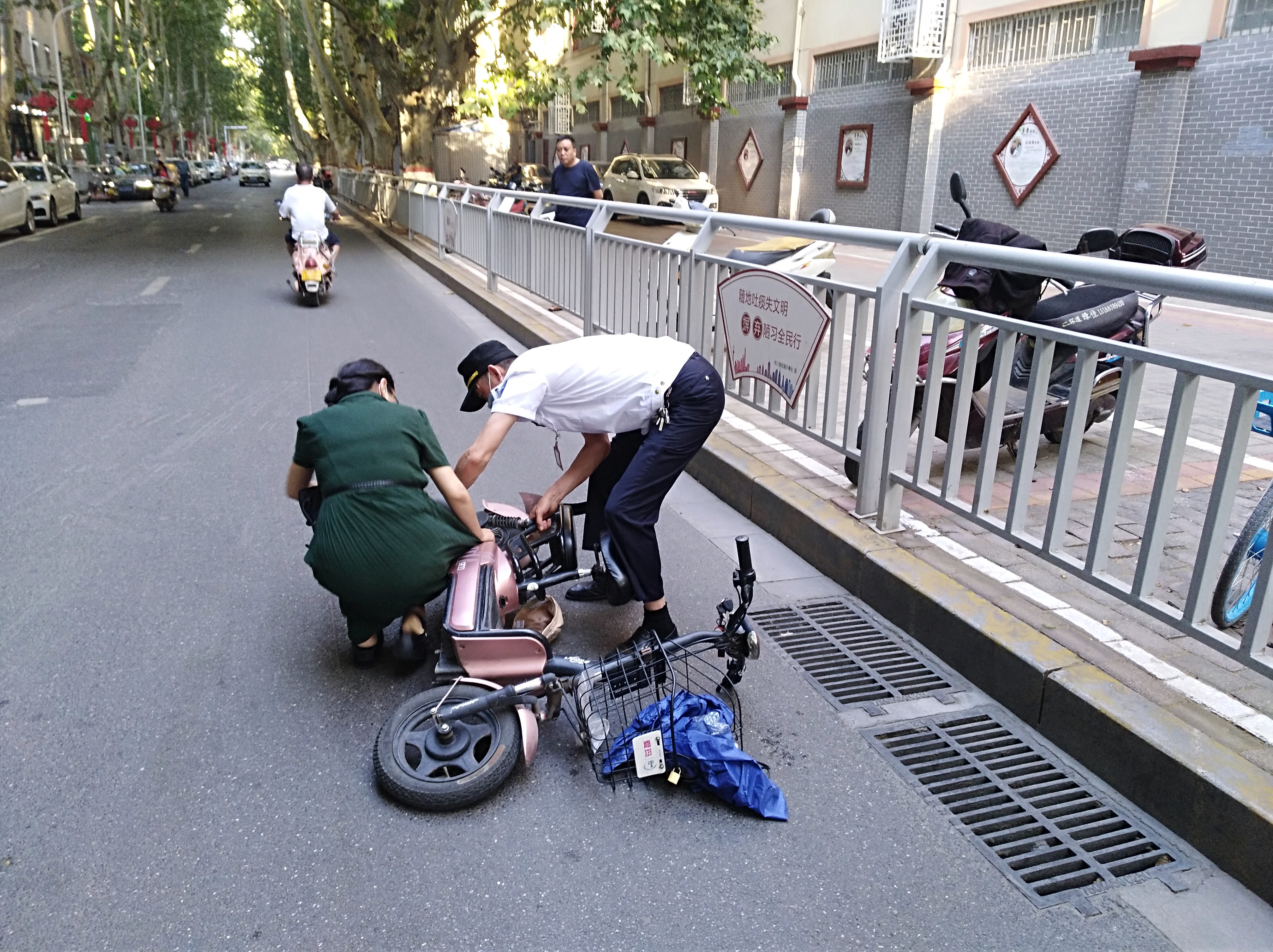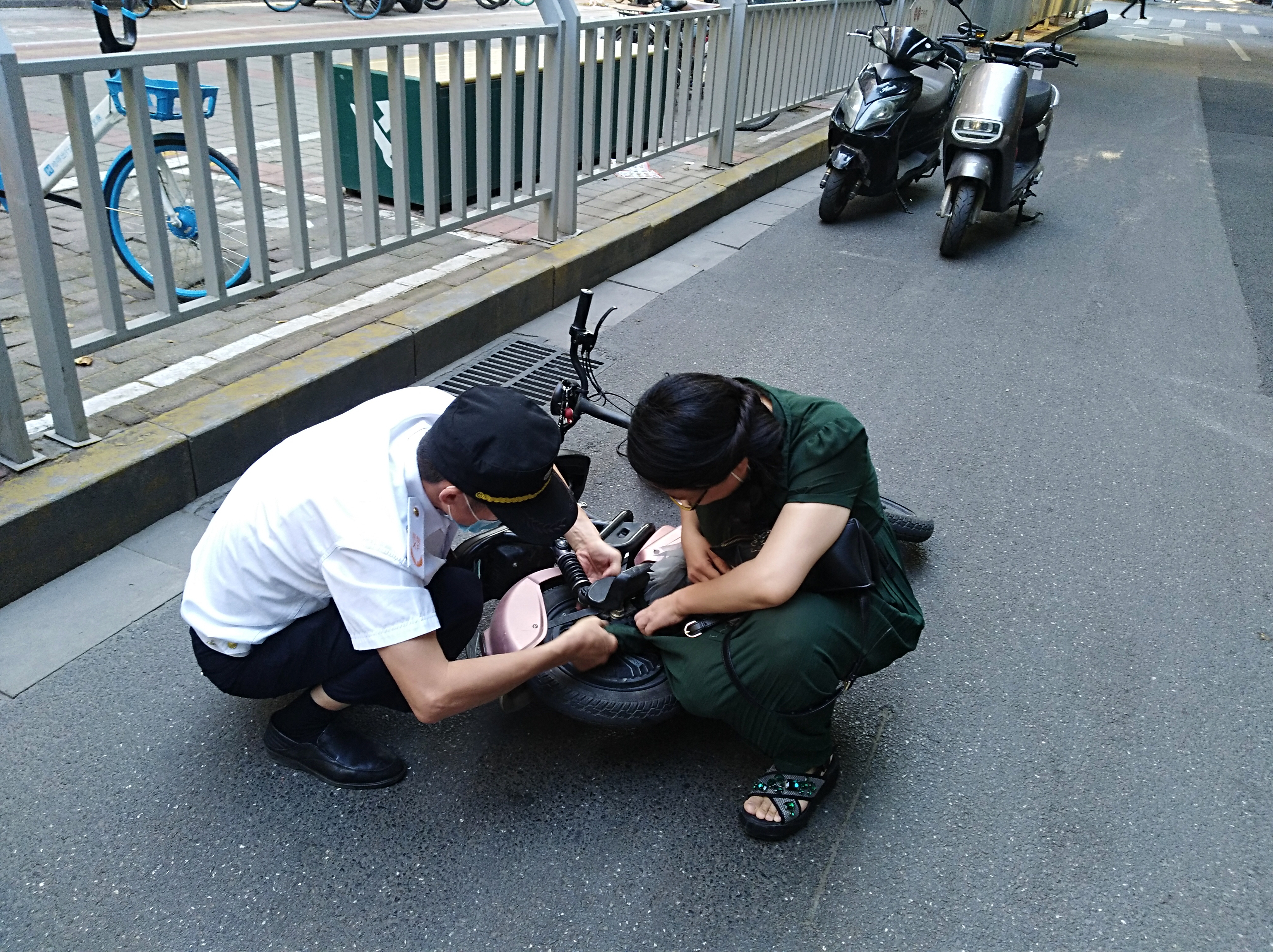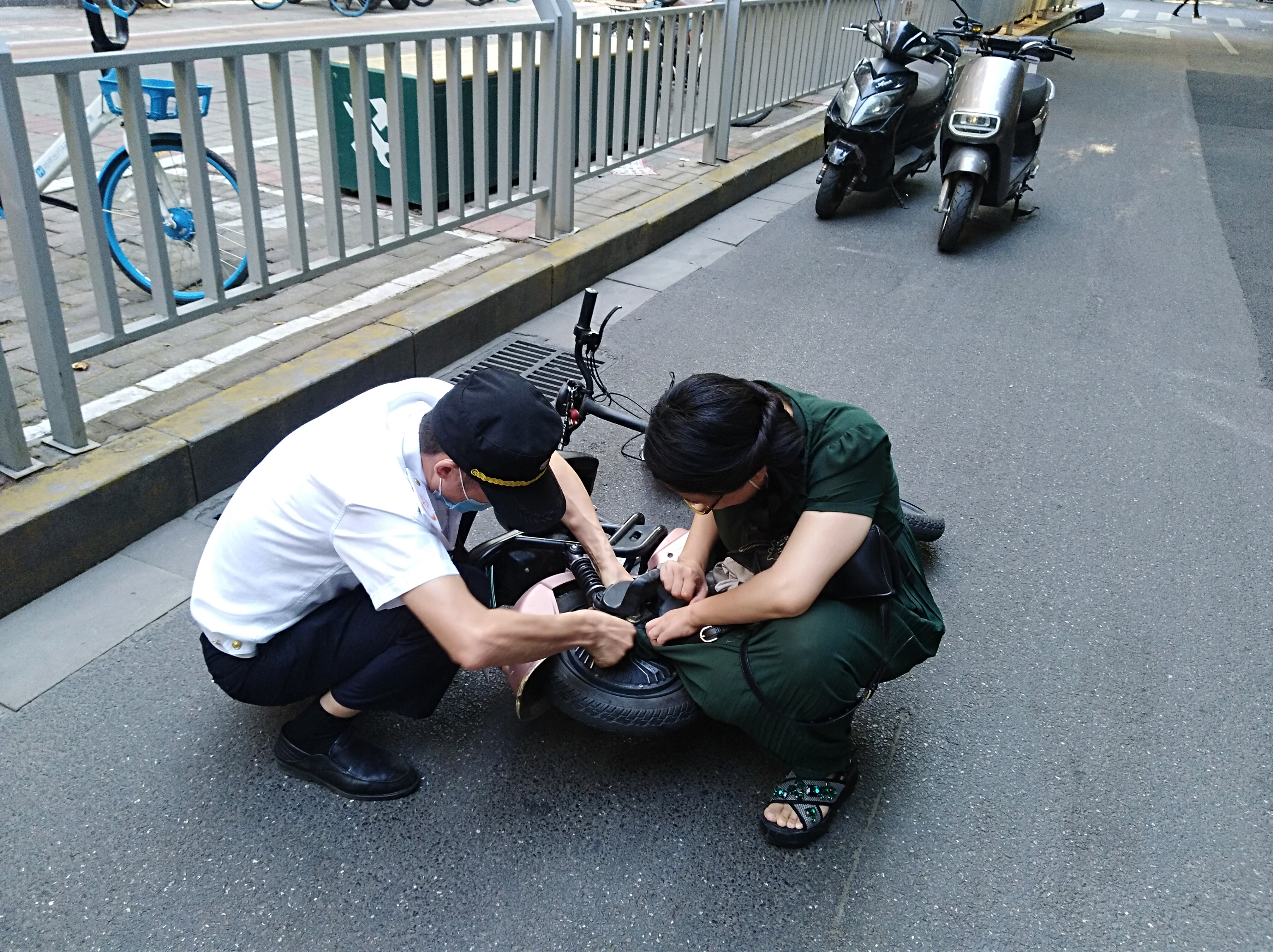 9月4日上午8时20分,在郑州市经八路与纬一路交叉口西约20米处,一名骑电动车的女子突然摔倒在地,动弹不得。原来,女子的裙角被卷进了电动车的后轮里,她试图把裙角从车轮中拽出,但因缠绕太紧,她拽了多次都没拽出来。因裙角缠在车轴中,导致女子无法与电动车分离,难以从地上站起,这让她十分尴尬和无助。正在路上巡逻的金水区经八路街道刅事处建文社区巡防队员孟庆斌、王艳州等人见状,赶紧上前帮忙,先用手转动车轮,慢慢将卷入的裙角从车轮中退出。等裙角被从车轮里拽出时,上面已经烂了几个洞,并且沾满了油污。随后,队员张永生将电动车从地上扶起,女子这才“重获自由”。