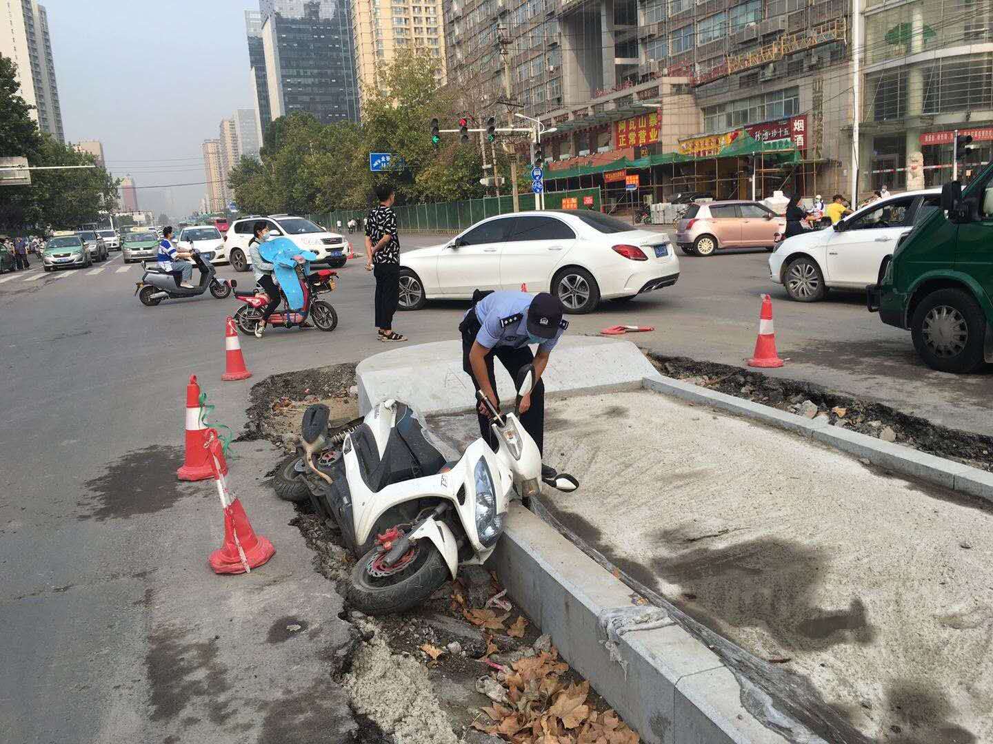 2020年9月14日上午8点30分许,郑州特警武装巡逻10号民警刘康、王鹏、杜小康驾车巡逻至航海路与淮南街交叉口时,发现马路中间的施工花台旁倒着一辆白色踏板摩托车,为避免影响花台施工和摩托车受到损坏,随后民警刘康将摩托车挪移到执勤路口安全位置。中午12点50分许,车长王鹏通过车牌信息联系到车主郭某(家住荥阳,荥阳上班)。
