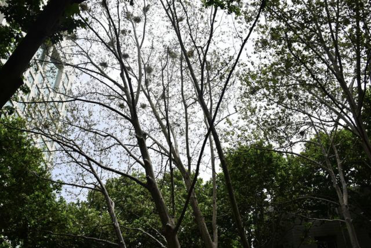 每年春夏时节,一群群夜鹭如期而至。成排的法桐上密密麻麻全是鸟巢,树影婆娑,鸟鸣啾啾,由此也带来了“天屎的烦恼”,路过的行人总会疾步匆匆。
