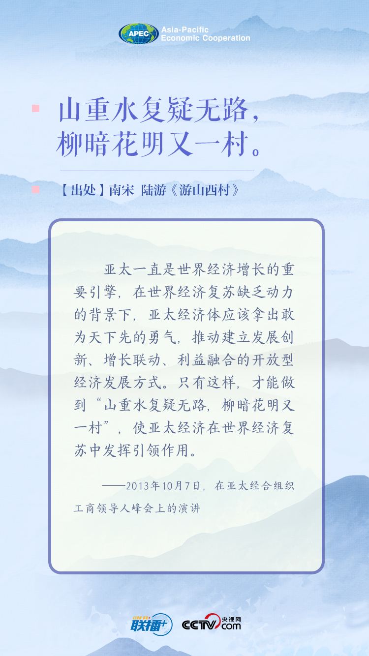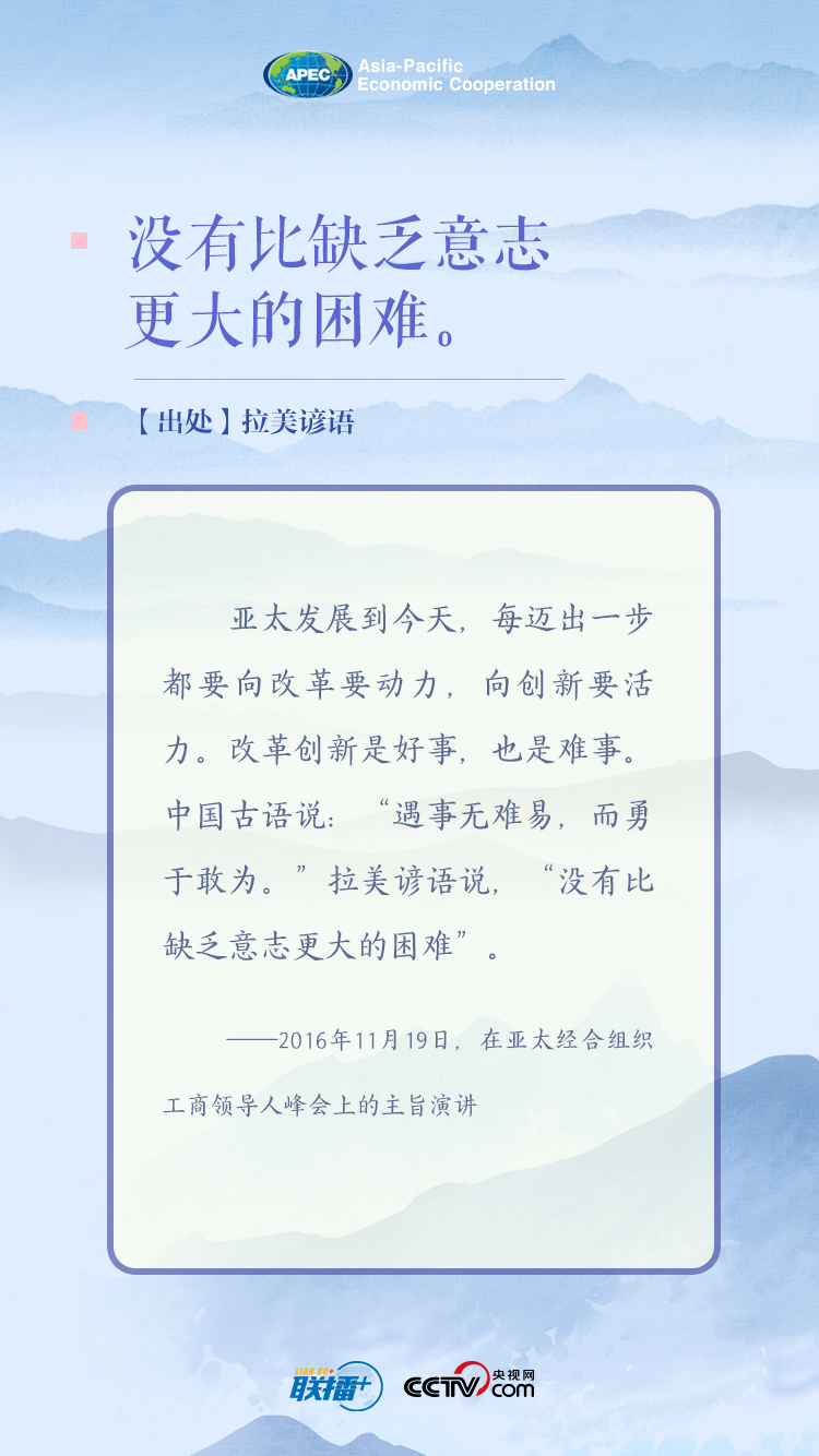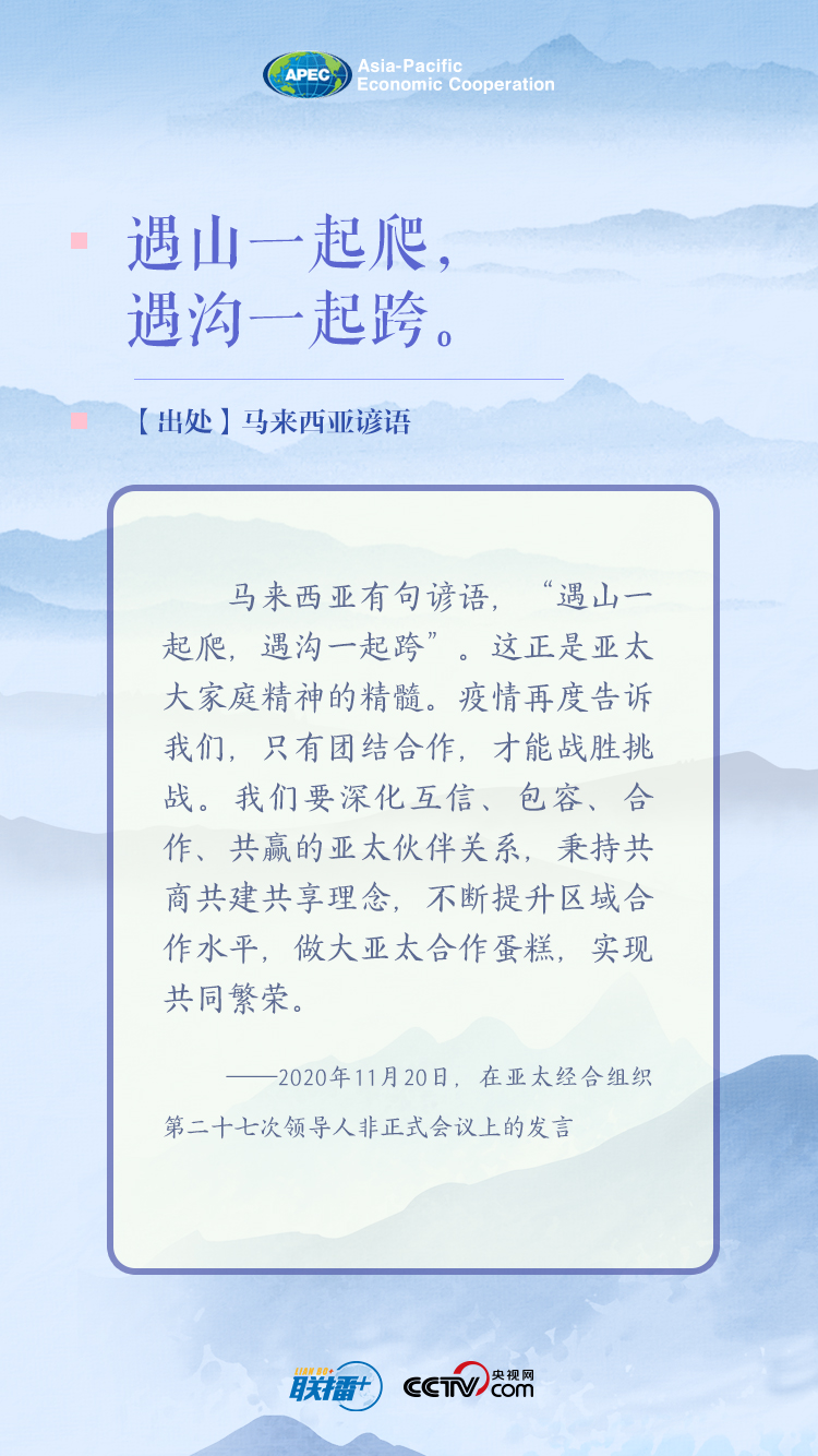 “马来西亚有句谚语,‘遇山一起爬,遇沟一起跨’。这正是亚太大家庭精神的精髓。”20日的讲话中,习近平主席巧妙引用外国谚语,强调亚太各成员要深化亚太伙伴关系,为疫情之下的亚太经济合作指明了方向。