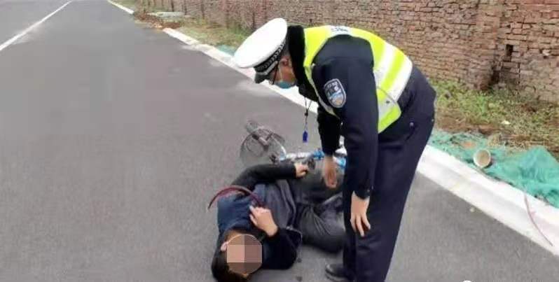 11月20日9时50分许,正在执勤的交通管理支队开发区大队民警,发现前方不远处有一名男子,骑着自行车突然昏倒在地,民警立刻上前查看,只见自行车倒在旁边,一名40岁左右的男子躺在地上,昏迷不醒,嘴角边有少许白沫,处于半休克状态。