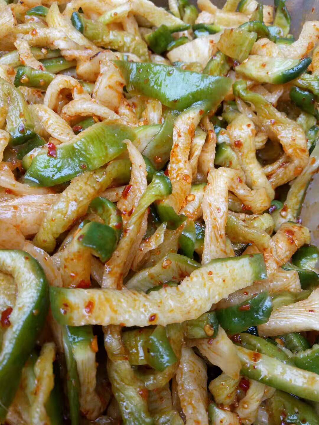 萝卜选好后,洗净切成拇指粗细的条,先用盐腌刹水。腌一夜,再刹水,然后将刹过水的萝卜条用自制的网兜装起来,放到脱水机里脱水。将脱水后的萝卜干放到帘子上晾,这叫除气,除去萝卜那处青气,用时两个小时左右。将白糖、辣椒油调入煮好的五香大料水中,将晾好的萝卜干放到坛子里,放入调好的料水,揉搓均匀,放置室外冷藏,一周内食用,即开即食,口味更好。