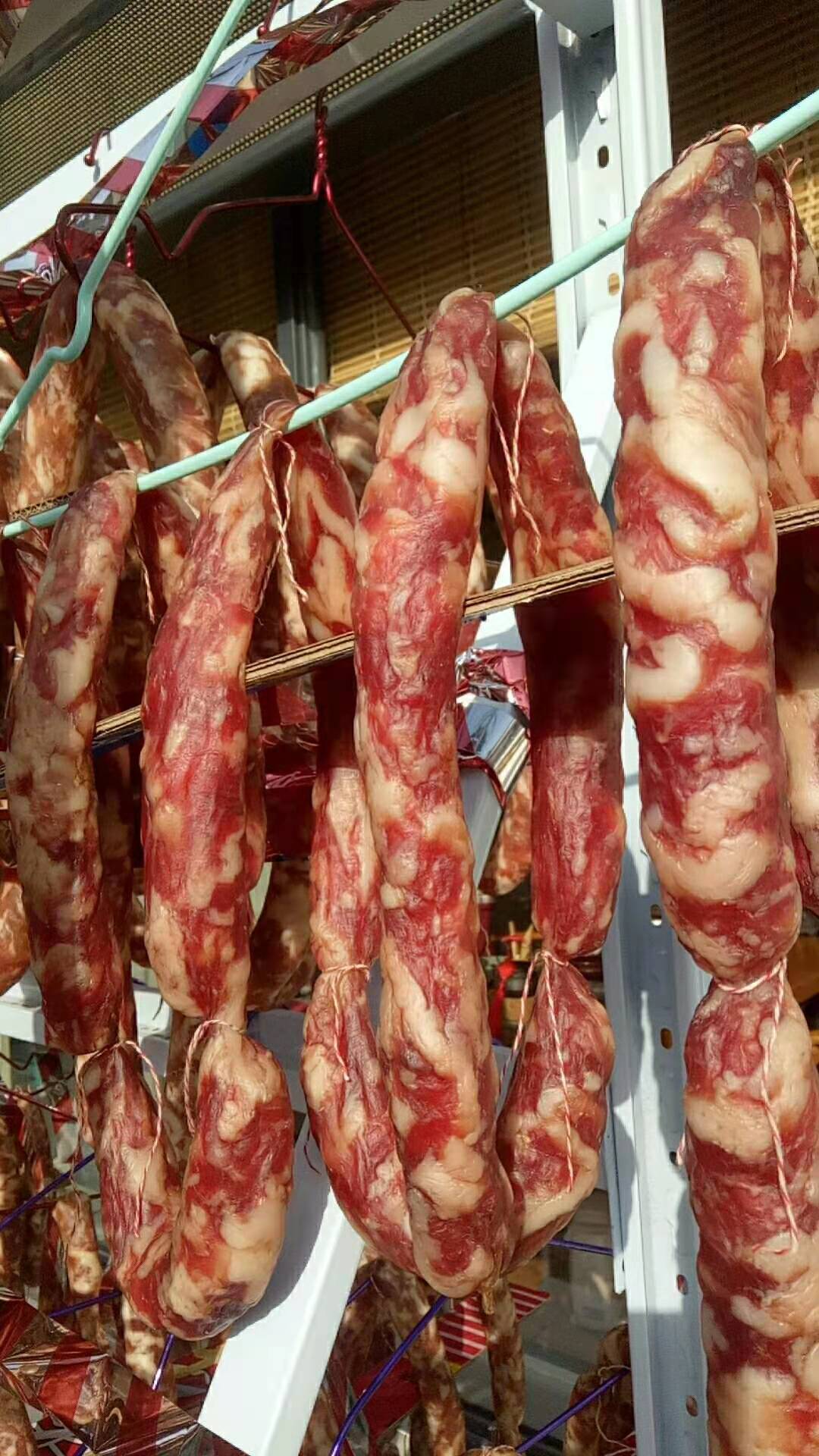 肉腌制好了,就开始装了,“在装制香肠时,一定要注意不要压得过死,容易烂,这就凭手感和经验了。装好香肠后,用缝制被子的棉白线扎成一段一段的,然后挂在外面阴晾处风干,一周后装入袋中放置冰箱冷冻室收藏,随吃随蒸,可配以蒜苗、姜汁调着吃,也可以切片直接吃。”