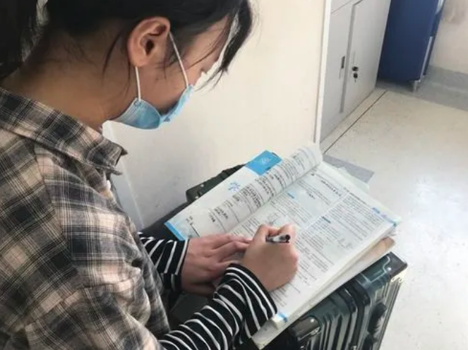 在河南省人民医院胸外科一病区,妹妹胡改革在行李箱上自学生物(12月22日摄)。新华社发