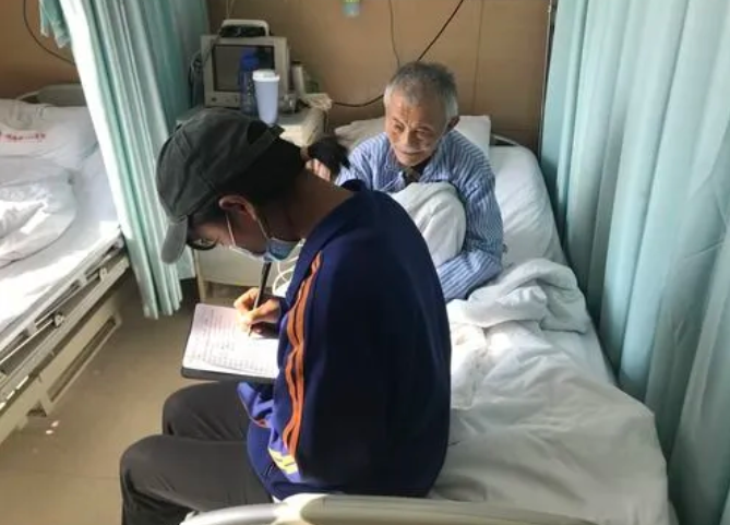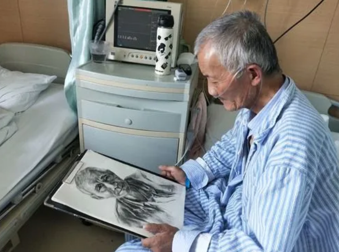 在河南省人民医院胸外科一病区,父亲看着女儿胡亚丽为自己画的画像。新华社发
