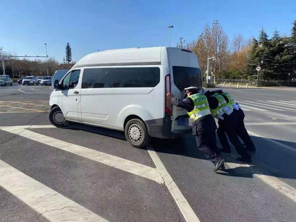2020年12月30日11时许,郑州市公安局交警九大队副大队长赵锴,带领韩磊、孔得荣等在平安大道开展专项整治工作中,发现一辆中型客车在绿灯时,没有正常行进。遂上前讯问,得知车辆故障,无法启动,为了不影响道路通行安全,民警们奋力的把车推到路边。