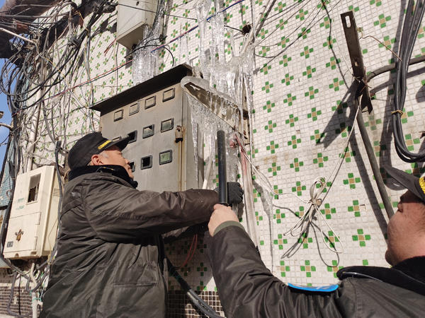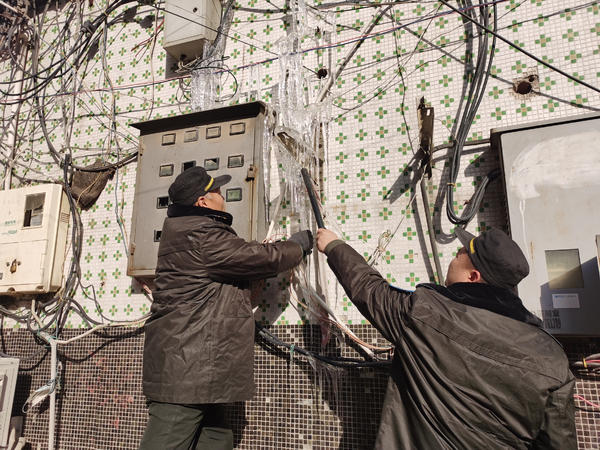 考虑到白天气温升高后,冰挂一旦融化会将水滴落到下面的电表箱里造成短路,同时担心冰挂脱落后伤人,几名队员决定将这些冰挂一一清除,消除隐患。在确定电表箱及电线均不带电后,几名队员分别用警棍敲击或者徒手掰断,很快将墙体上的冰挂清除。