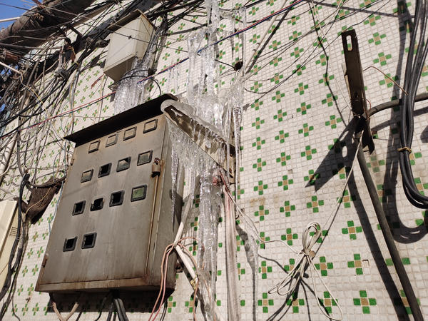 水管冻裂形成冰挂,悬在楼外如“利剑”