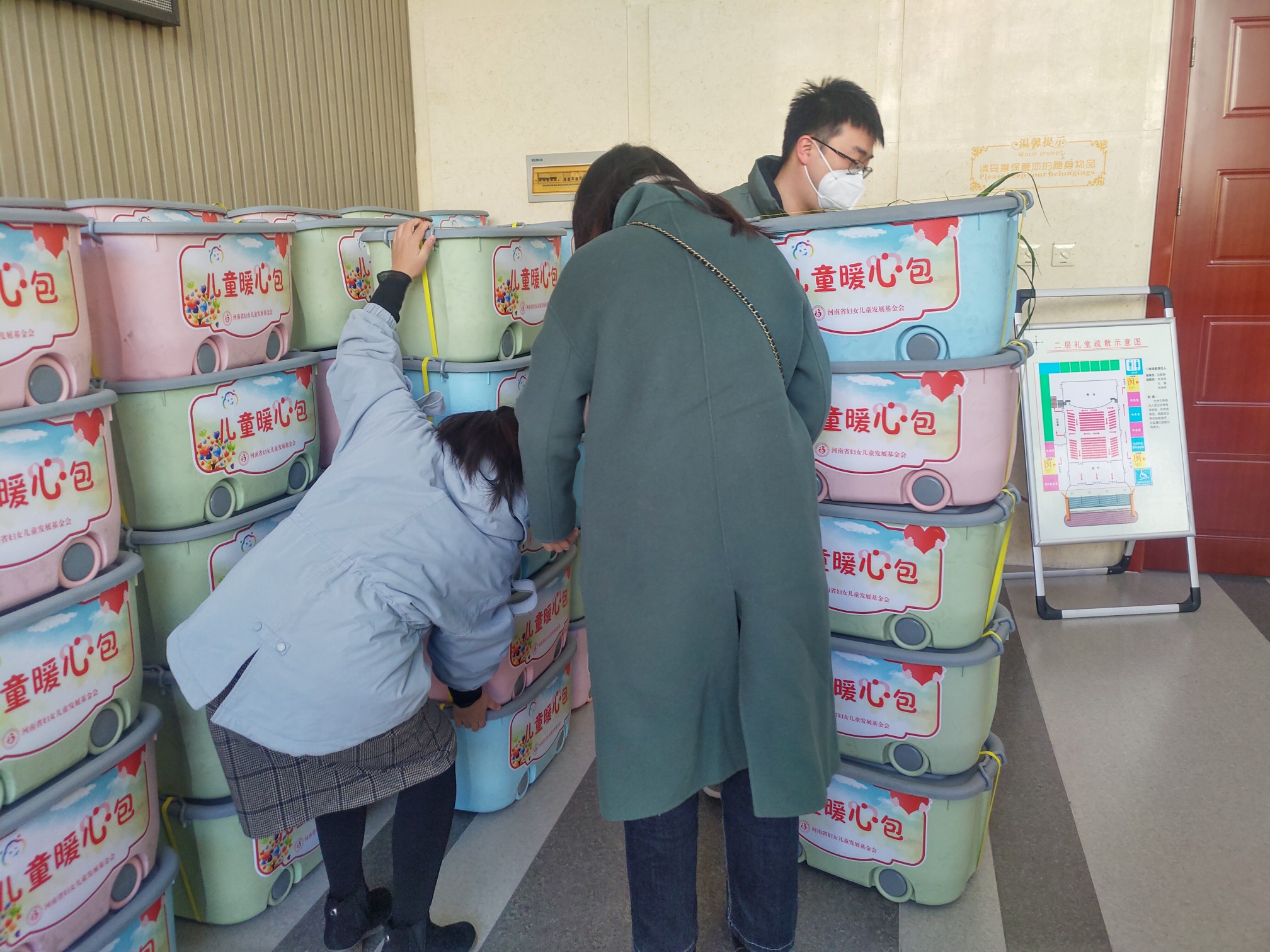 工作人员搬运儿童暖心包