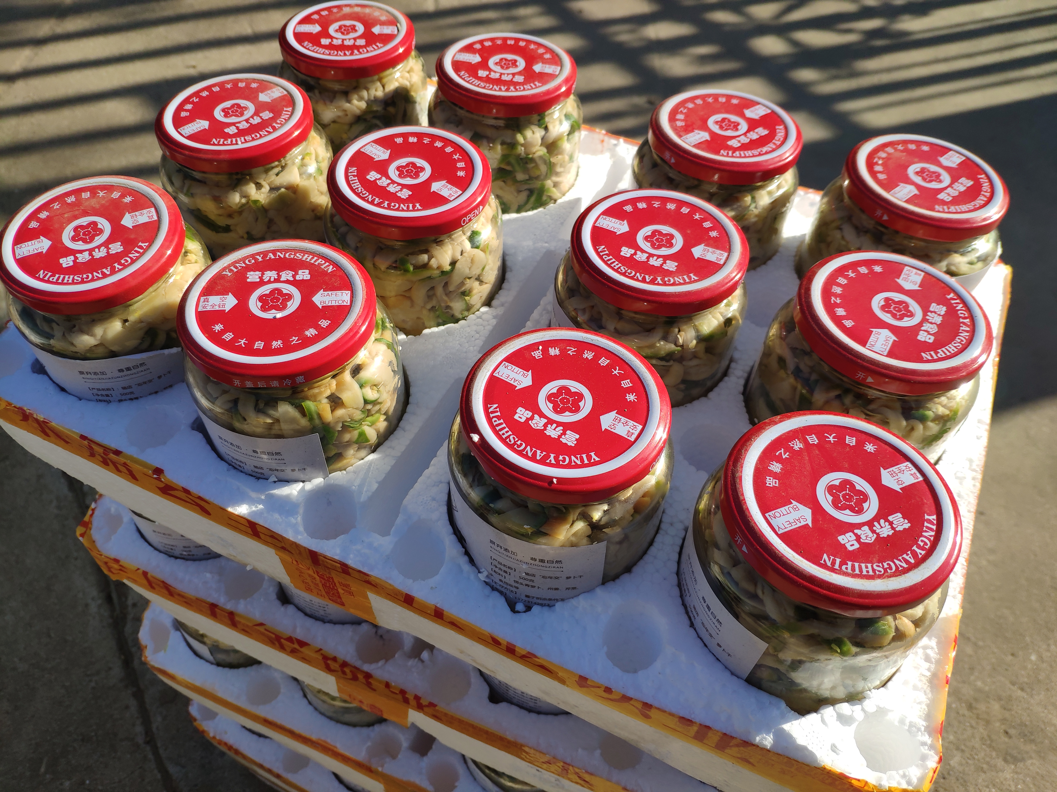 中午时分,寒气消散,暖阳高照。展销会上,骆店村共创合作社生产的古法秘制萝卜干备受青睐。骆店村“忘年交”萝卜干以本村特有沙壤土质种植的愣头青萝卜为原料,佐以潢川特有的光州姜,使用传统泥瓦盆为容器腌制,充分发酵后经竹席晾晒,纯手工制作,口感甚佳。县教体局、县五小、北大附属潢川实验幼儿园、潢川圣光集团以及参加活动的群众们纷纷抢购。
