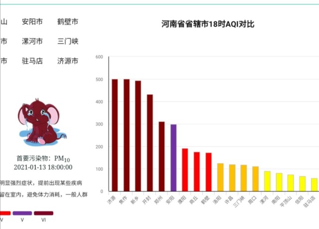截至1月13日下午18时,济源、焦作、新乡、开封、郑州均为严重污染,安阳为重度污染。其中,济源、焦作空气质量指数还超过500,出现“爆表”,新乡空气质量指数493,接近“爆表”。同样,1月13日下午15时左右,郑州市空气质量指数453,下午14时,岗李水库、烟厂监测点,空气质量指数分别达到488、495,均非常高。