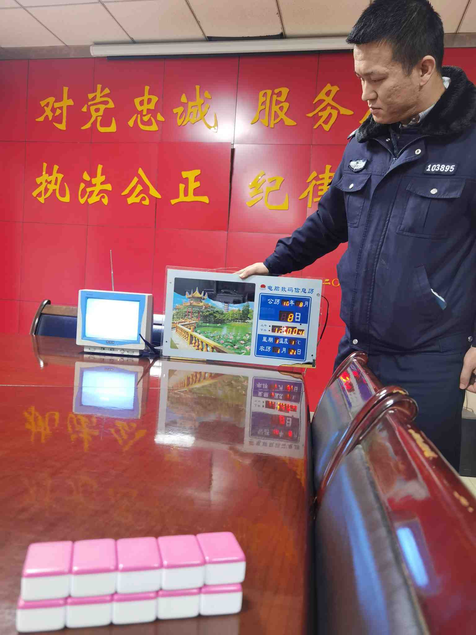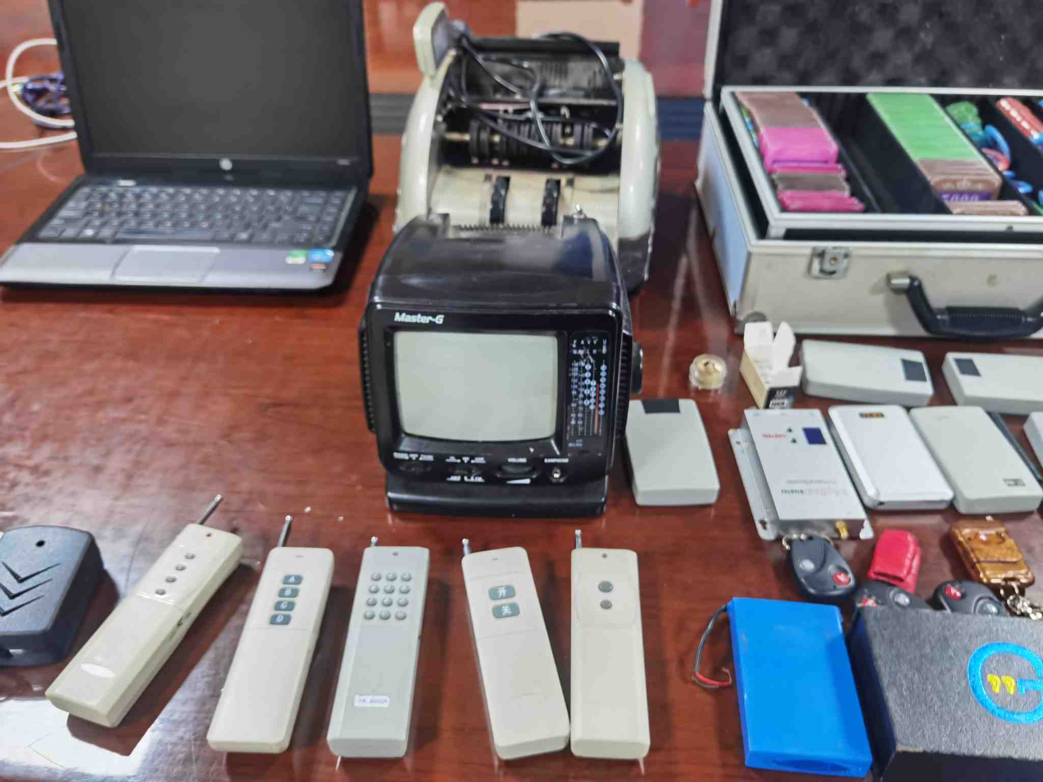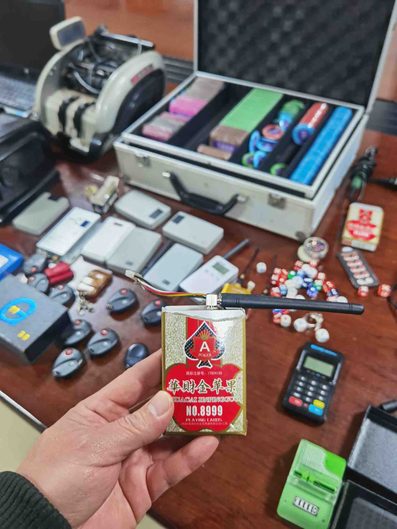 当晚10时许,民警来到小区12号楼11楼1101房间门口,听到房间内传来声音吵杂,为了不打草惊蛇,民警立即调集10余名警力赶到现场布控。凌晨1时许,警方决定进行收网行动,为不引起注意派出了一名女民警来到房间门口,故意反复大声拍打房门喊道:“你们在干啥?还让不让人睡觉了!”听到响声房门打开,里面的一男子刚想露头出面解释,蹲守的民警迅速拉开房门冲了进去,一瞬间,客厅里一群打牌的人被当场控制。现场检查时,民警发现这套两室一厅住房其中一间卧室房门紧闭,打开后发现一男子正慌乱的整理监视器,画面上竟清晰的显示着客厅牌桌上牌九的点数。通过搜查,民警还发现了微型窃听器、透视麻将牌、遥控筛盅、磁铁戒指、特制发牌桌等几十余种赌博“出老千”工具,而客厅墙上一个装有特制摄像头的电子时钟箱竟可以透视桌上多个参赌者的牌点。随后,民警将涉案工具和现场11名涉案人员带回派出所进一步处理。