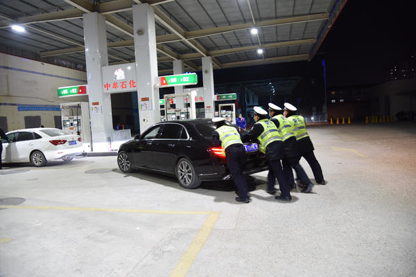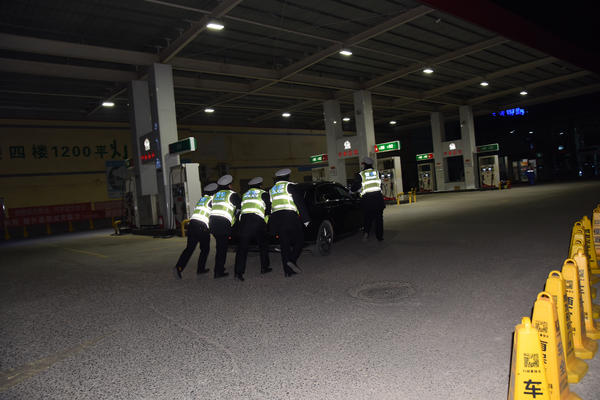 据该奔驰车司机讲,他晚上准备开车外出吃饭时,发现油箱里的油已经快用完了,想着家离加油站也不远,便开车往加油站赶,没想到行至此处,车里的油就耗光抛锚,幸亏遇到交警在此处执勤,帮他把车推到了加油站,否则麻烦就大了。(信息提供 张玉明 朱歌谣)