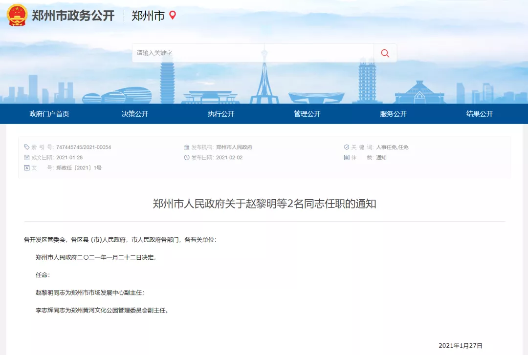 郑州市人民政府关于赵黎明等2名同志任职的通知
