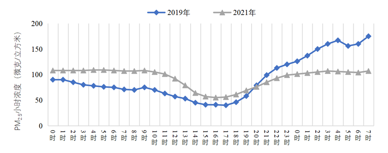 2019年和2021年除夕至初一全省逐小时PM2.5平均浓度