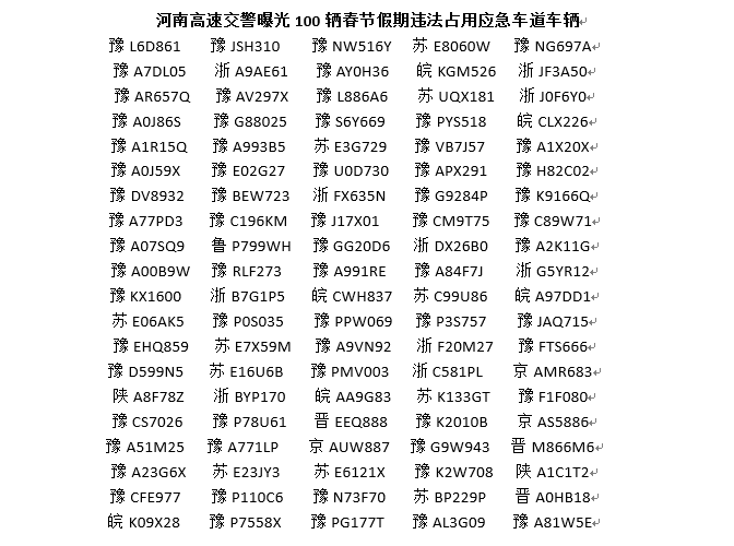 当前正值春节后返程高峰,高速警方严查占用应急车道违法行为,利用高速公路电子视频监控设备,进行24小时全天候监控,对监控设备抓拍的占用应急车道违法行为,通过情报信息板等方式予以警示,并一律依法从严处罚。同时邀请广大交通参与者通过河南高速交警报警电话0371-68208110、河南高速交警举报违法邮箱980105600@qq.com,向高速警方举报违法占用应急车道、客车超员等交通违法,高速交警将对举报信息依法审核处理,警民携手,让交通违法无处藏身。