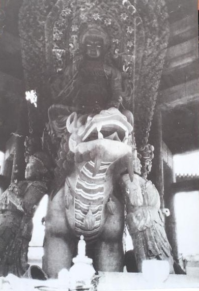 照片由北京史地民俗学会副会长刘阳捐赠,也是此次发布的压轴大片。从这张老照片上清晰可见,亭内文殊菩萨骑青狮之像,总高三丈;左右立二童,左为狮奴,右为韦陀,皆高八尺。文殊菩萨像及其背光均为木质包金,狮与二童均五彩拨金,下承汉白玉石台。