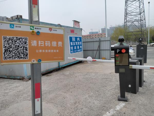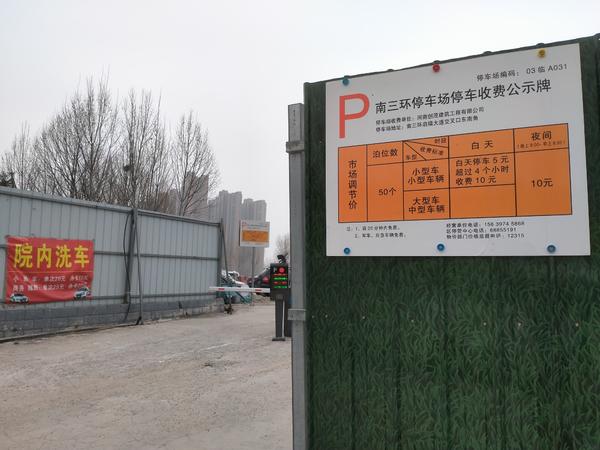 门口悬挂的P字停车牌显示“南三环停车场停车收费公示牌”,停车单位是河南创茂建筑工程有限公司,上面并留有收费标准及停车场编码和监督电话等信息。