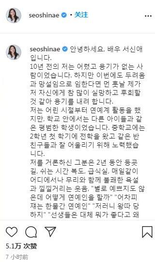 韩国演员徐信爱在社交媒体上发文称,自己曾受到校园霸凌。图片来源:徐信爱社交媒体个人账户截图。