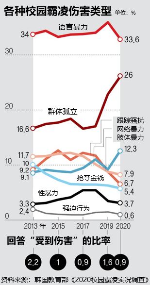 韩国校园霸凌受害类型。图片来源:韩国《中央日报》