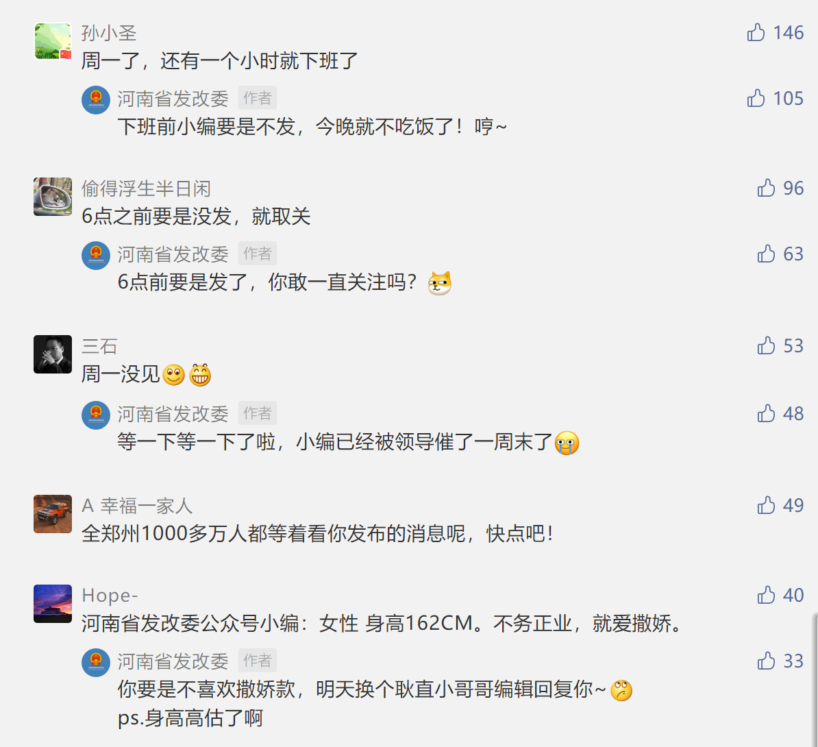 其实在《规划》出台之前, 河南省发改委的微信公众号就发了4月19日要出台《规划》的预告,许多网友早早地搬着“小板凳”坐等,活泼的公众号小编及时与网友互动,着实吸粉不少。