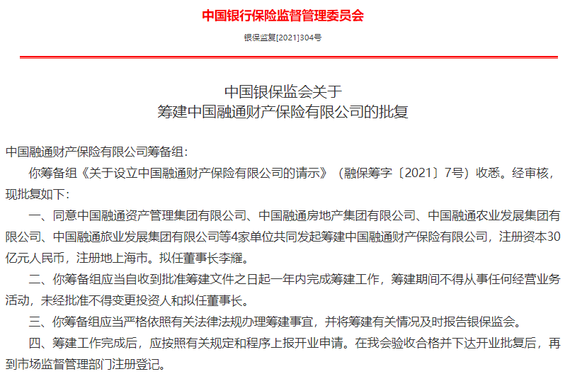 近日,银保监会发布批复通知,同意中国融通资产管理集团有限公司、中国融通房地产集团有限公司、中国融通农业发展集团有限公司、中国融通旅业发展集团有限公司等4家单位共同发起筹建中国融通财险,注册资本30亿元,注册地上海市。