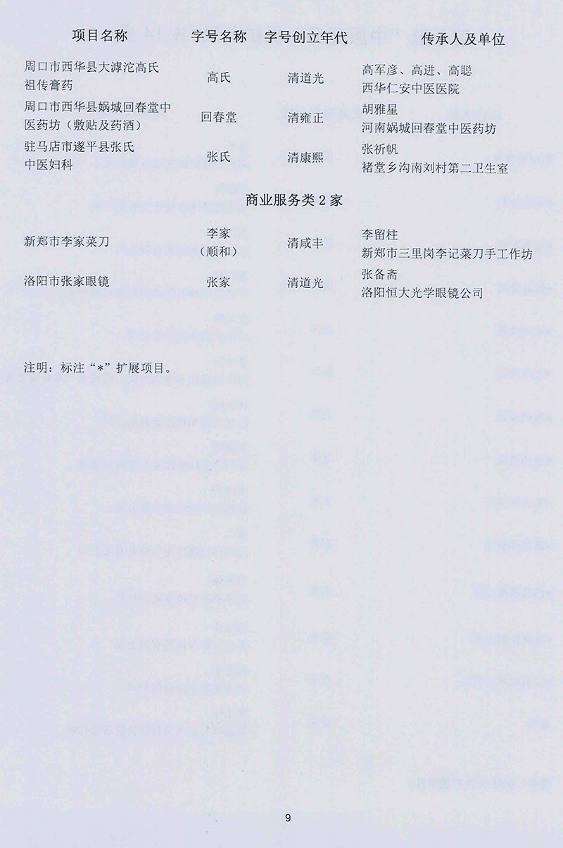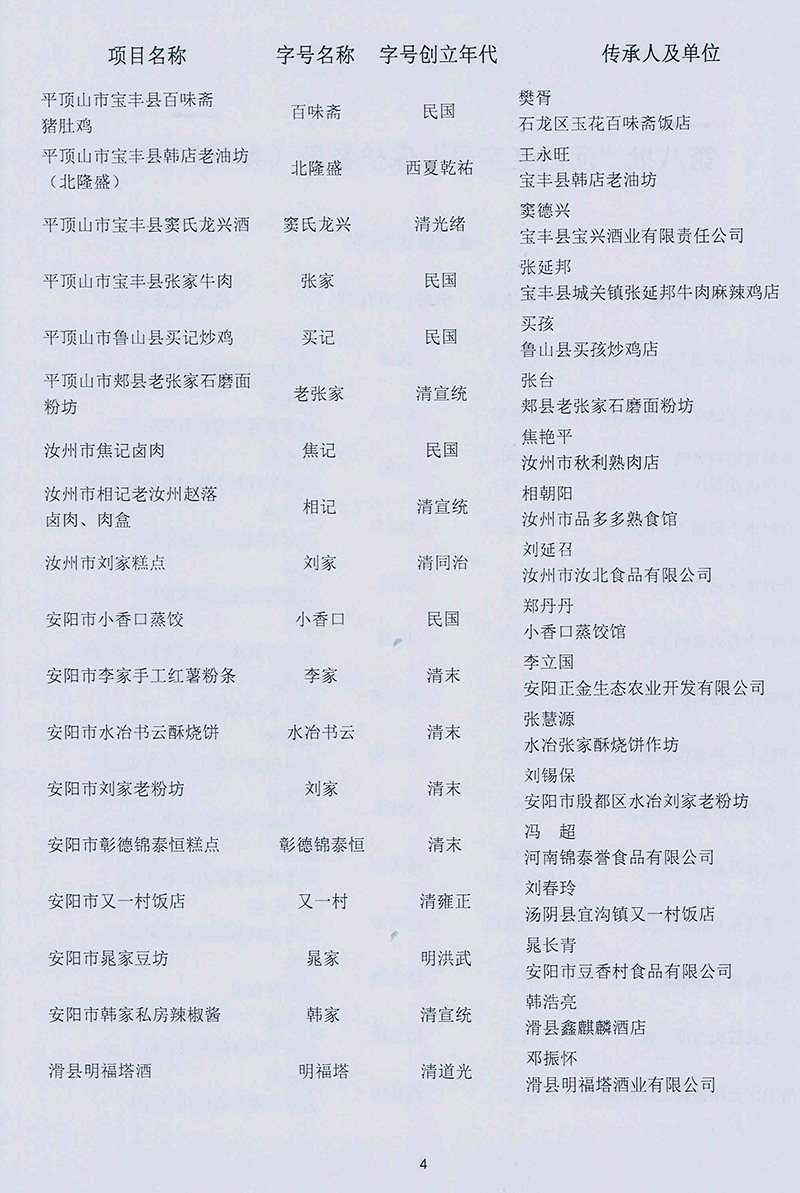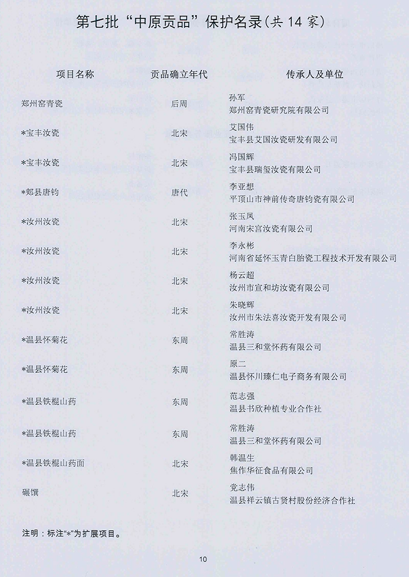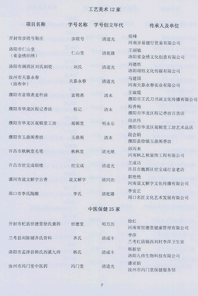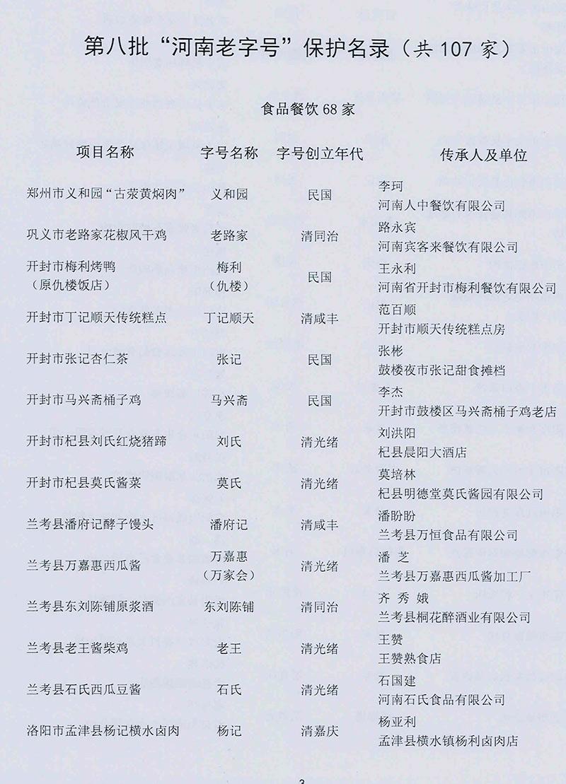 经组织专家评审和社会公示,此次共确定《第八批“河南老字号”保护名录》107家,其中,郑州义和园“古荥黄焖肉”、巩义市老路家花椒风干鸡等68家食品餐饮类,开封市步陞号鞋庄、洛阳市仁山堂等12家工艺美术类,开封市杞县世德堂徐氏膏药、兰考县刘陈铺齐氏骨科等25家中医保健类,新郑市李家菜刀等2家商业服务类;郑州窑青瓷、宝丰汝瓷、郏县唐钧、汝州汝瓷等14家确定为《第七批“中原贡品”保护名录》。