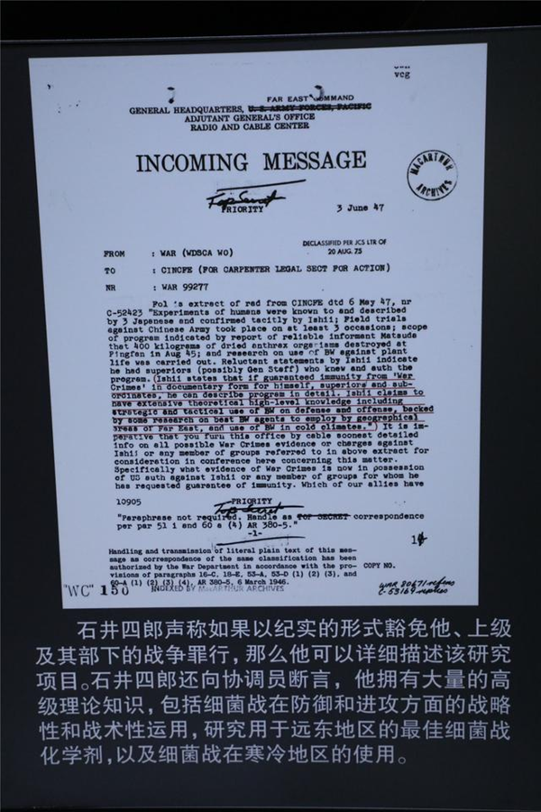二战结束后,美国在几年时间内陆续派德特里克堡基地细菌战专家前往日本,向包括731部队头目石井四郎在内的731部队主要成员了解日本细菌战情况。