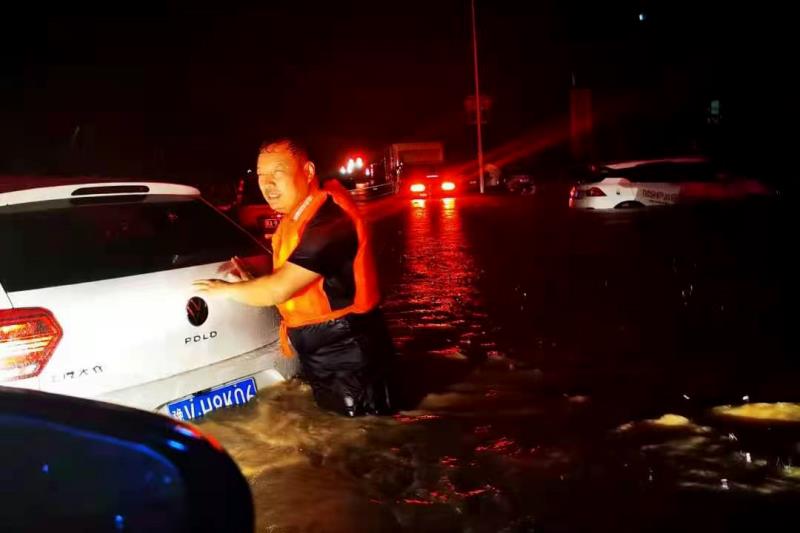 因地势较高,金光路派出所办公区积水相对较浅。派出所所长孟源立刻组织民警,把被困街上的群众带到所里避难。当晚天黑雨急视野较差,孟源让民警把门口警车按序排开,打开警灯,用彻夜长明的警灯引导帮助附近群众前来避难。